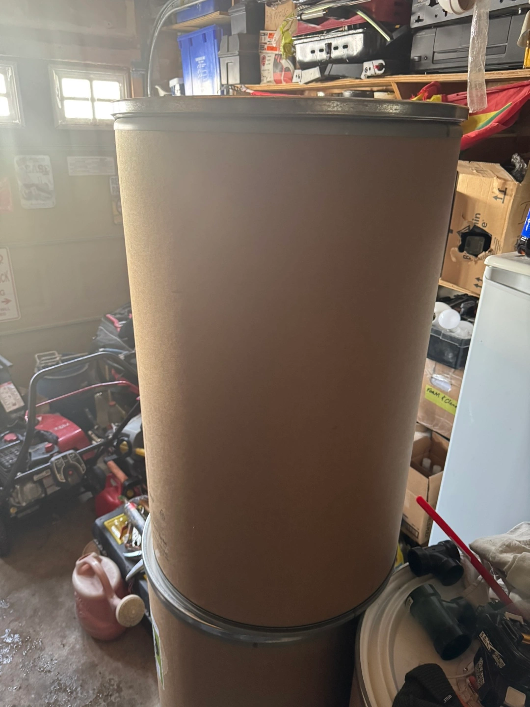 20Pair of empty cardboard drums. Metal bands around top and bottom. Good for storage or transport.