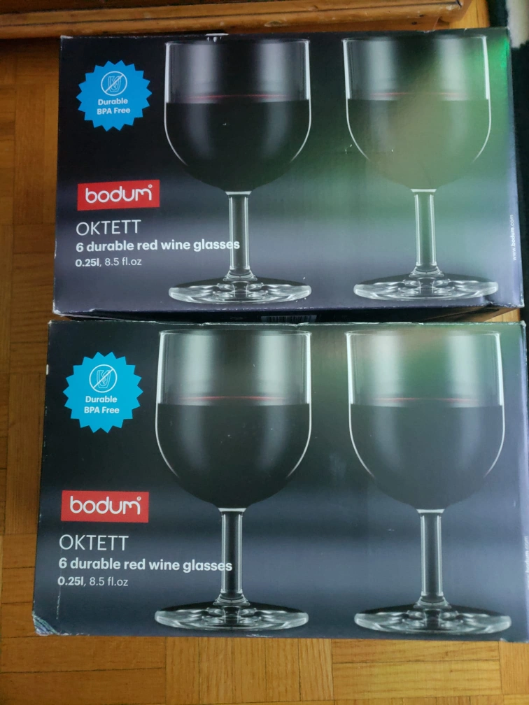 Two boxes of Bodum Oktett red wine glasses. Twelve glasses total. Durable, BPA free. New in box.