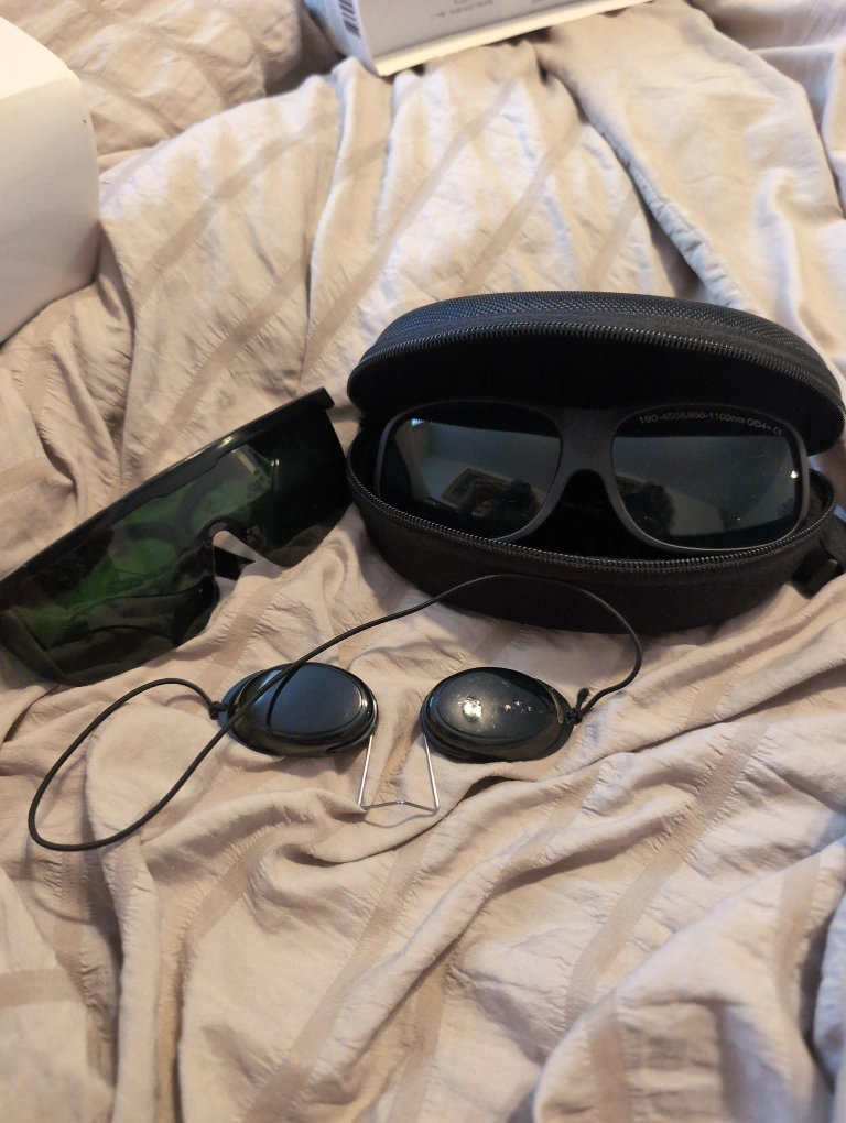 Set of laser safety glasses, includes two pairs. One pair of regular glasses and one pair of eye protectors. Protective eyewear for laser procedures. Comes with a protective carrying case.