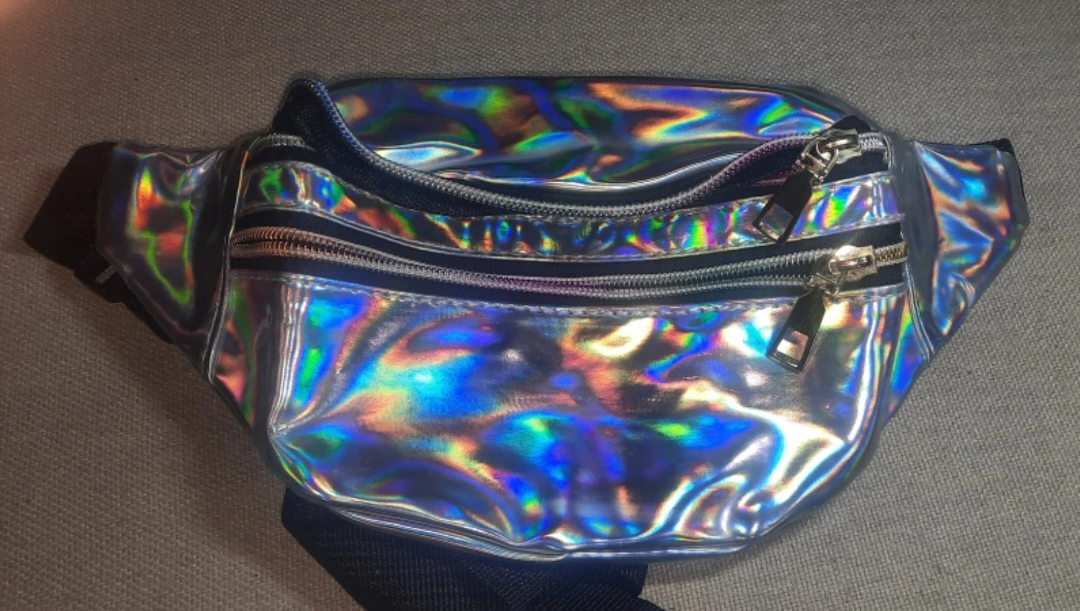 Rainbow iridescent fanny pack. Adjustable black strap. Two zippered compartments. Great for festivals or everyday use.