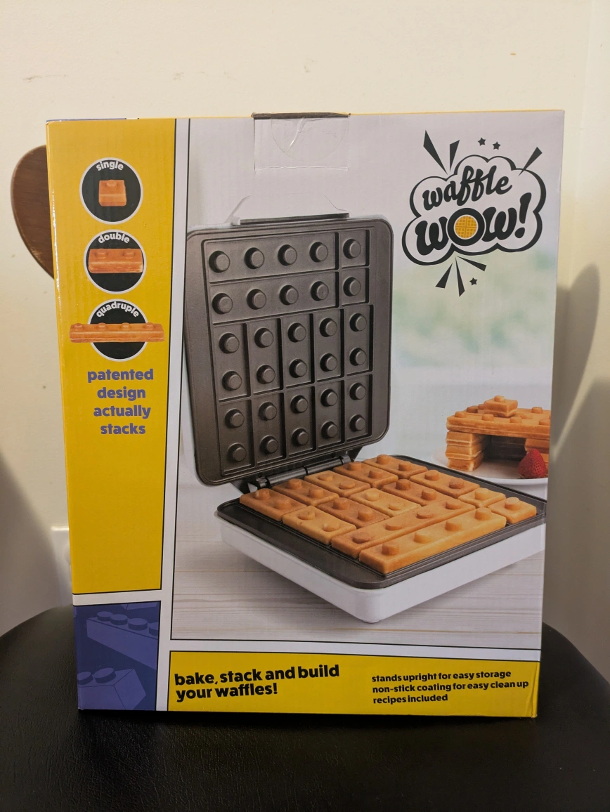 New waffle maker. Makes waffles shaped like building blocks. Patented design, stacks waffles. Non-stick coating for easy cleanup. Recipes included. Stands upright for easy storage.