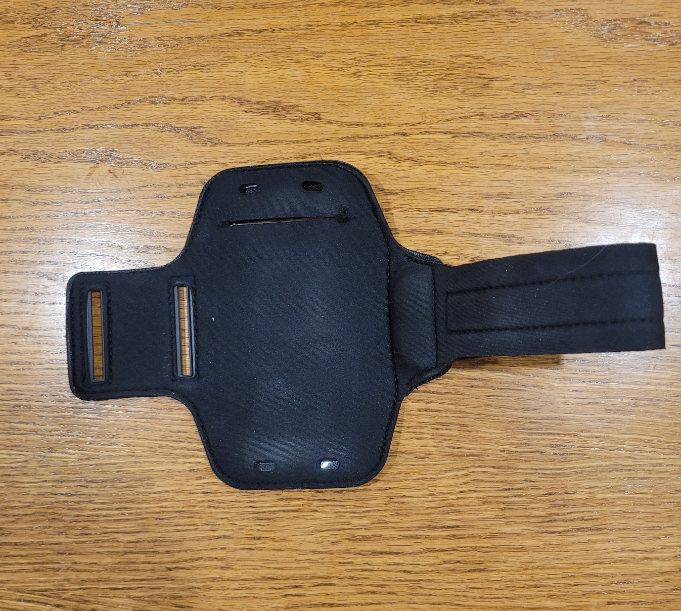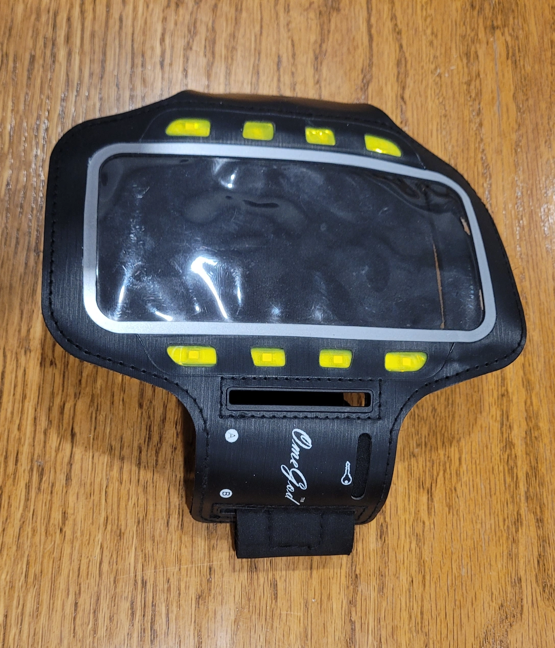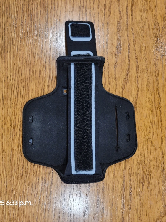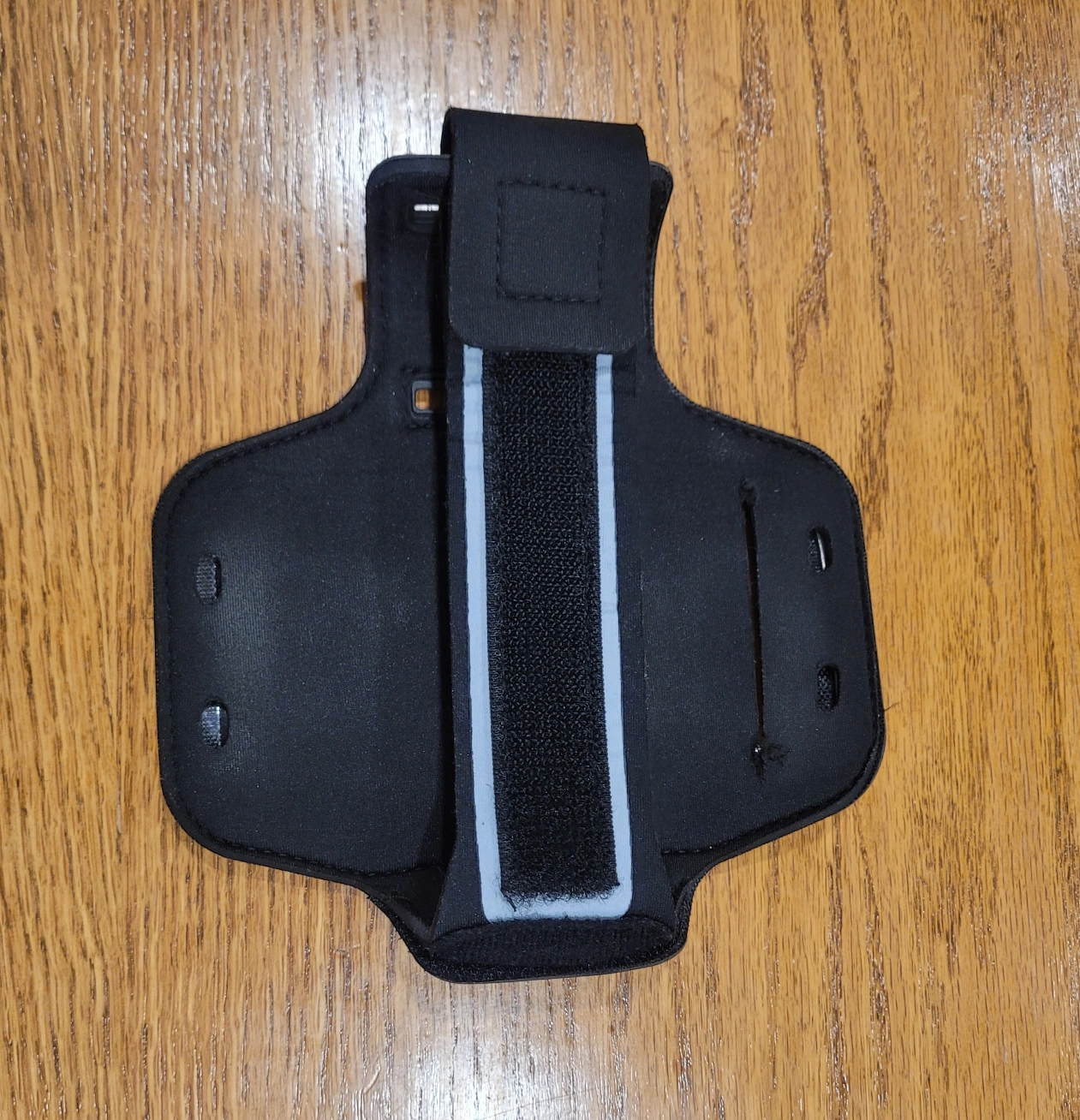 Black armband for smartphones. Features reflective accents. Adjustable Velcro strap. Small key holder included. Good for running or other activities.