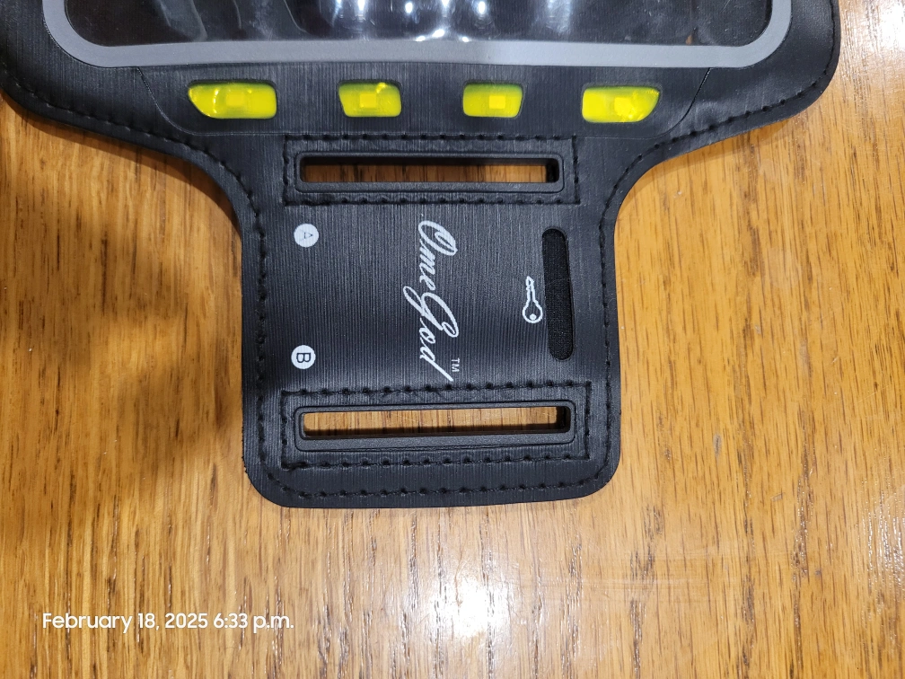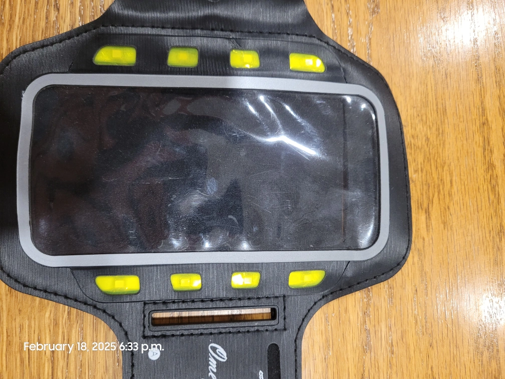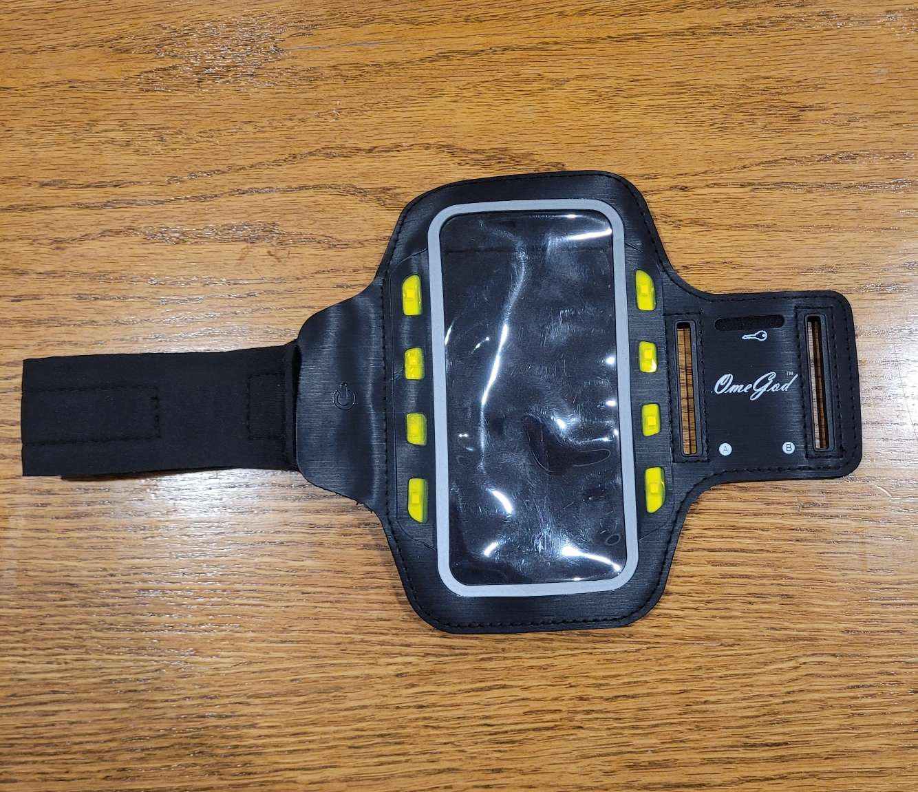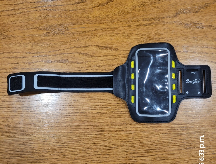 Black armband for smartphones. Features reflective accents. Adjustable Velcro strap. Small key holder included. Good for running or other activities.