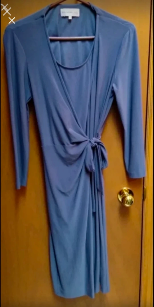 Knee-length jersey wrap dress. Three-quarter sleeves. Self-tie at waist. Beautiful dusty blue-grey colour. In new condition.