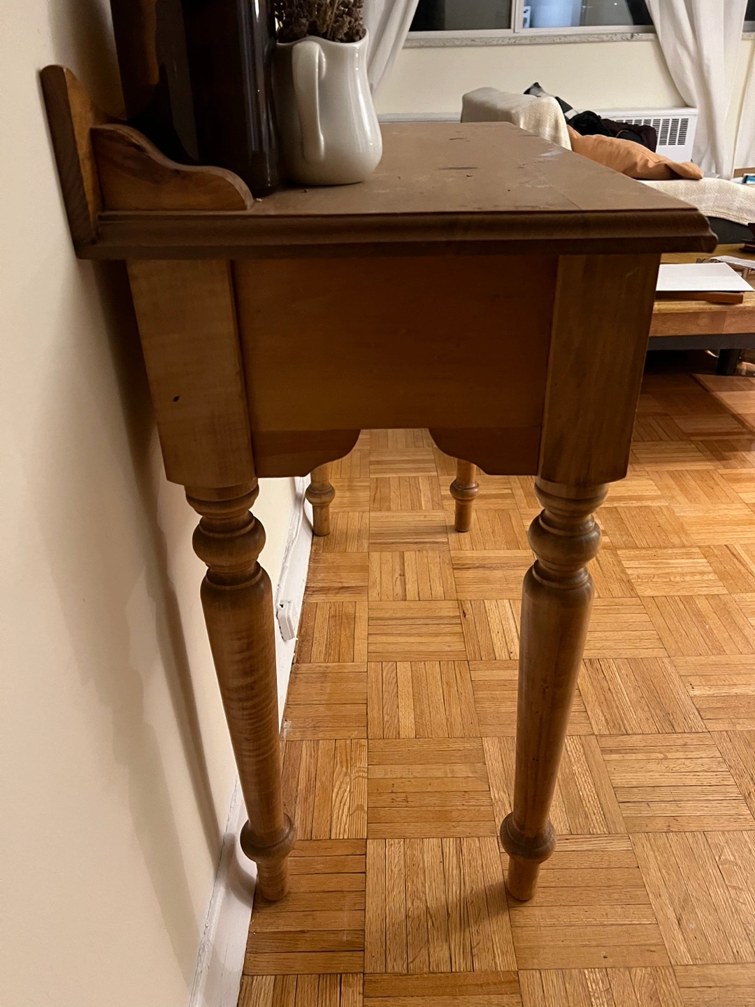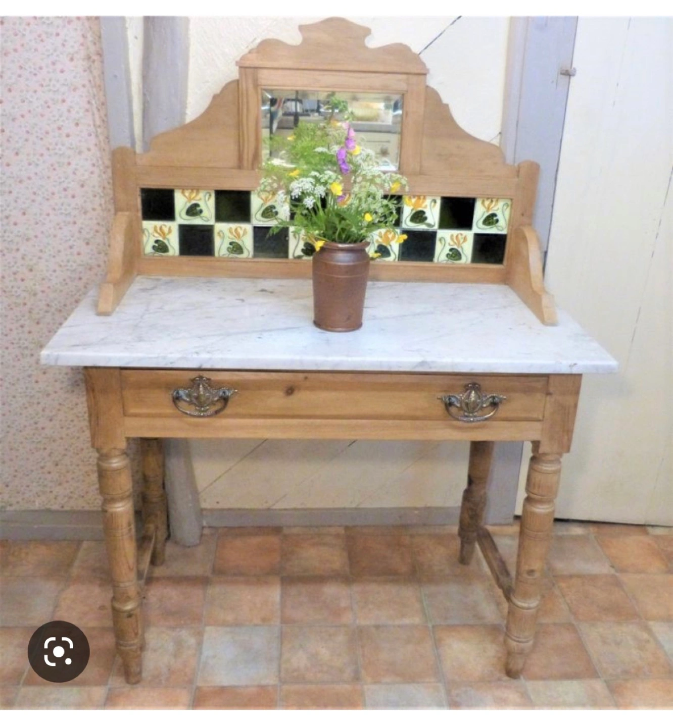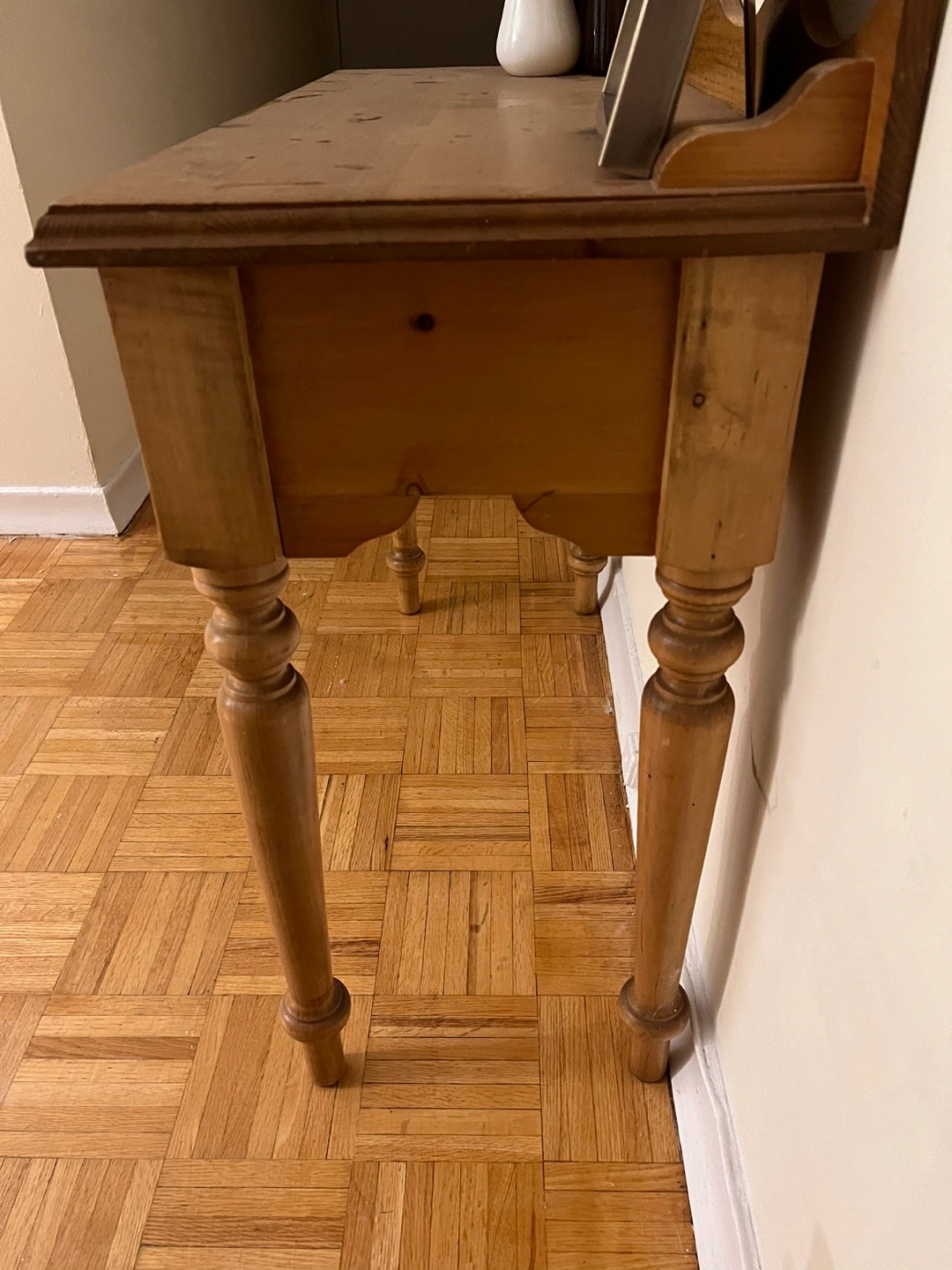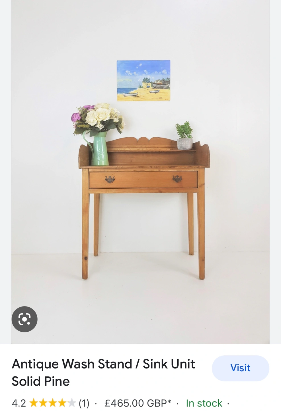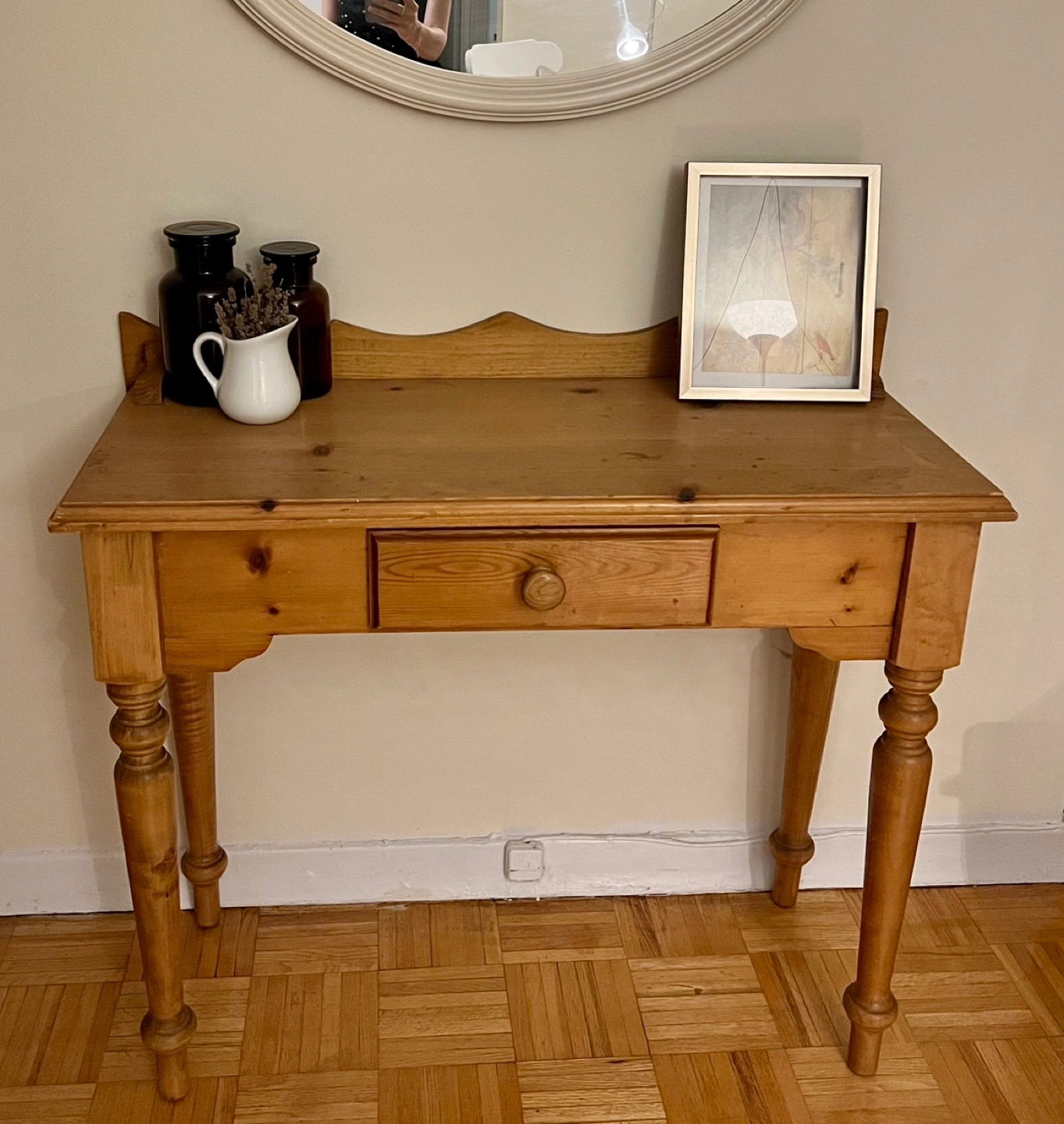 Solid pine. You can paint it decorate it with some mosaics or simple play with the wood’s color with a wood finish for a more modern look or leave it as it is (like me) if you love the vintage look! Can be used as a console table or a small writing table. The real vintage lovers shouldn’t miss it 🥰