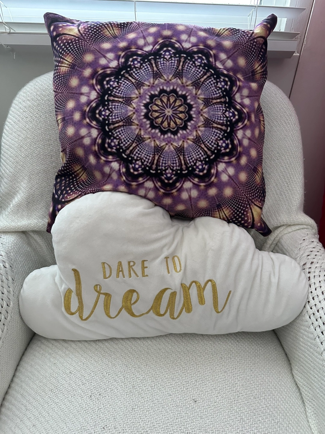 Two decorative throw pillows. One square pillow features a mandala design in purple and beige tones. The other is cloud-shaped with gold lettering that says "Dare to Dream". Perfect for adding a touch of bohemian style to your living space. Pet and smoke free home