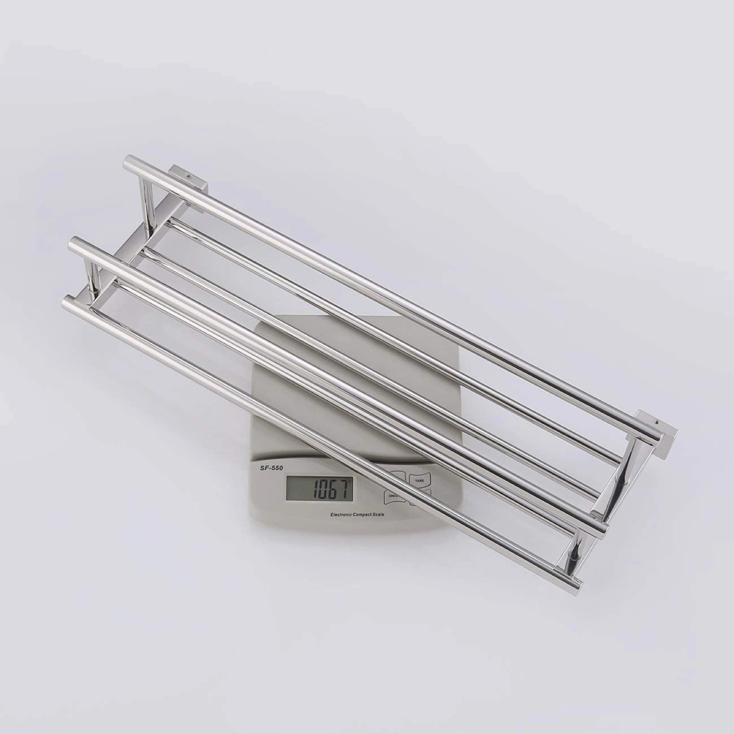 Attractive, stainless steel bathroom towel shelf. Double bars. Never opened. Mountable and light weight. Dimensions in picture.