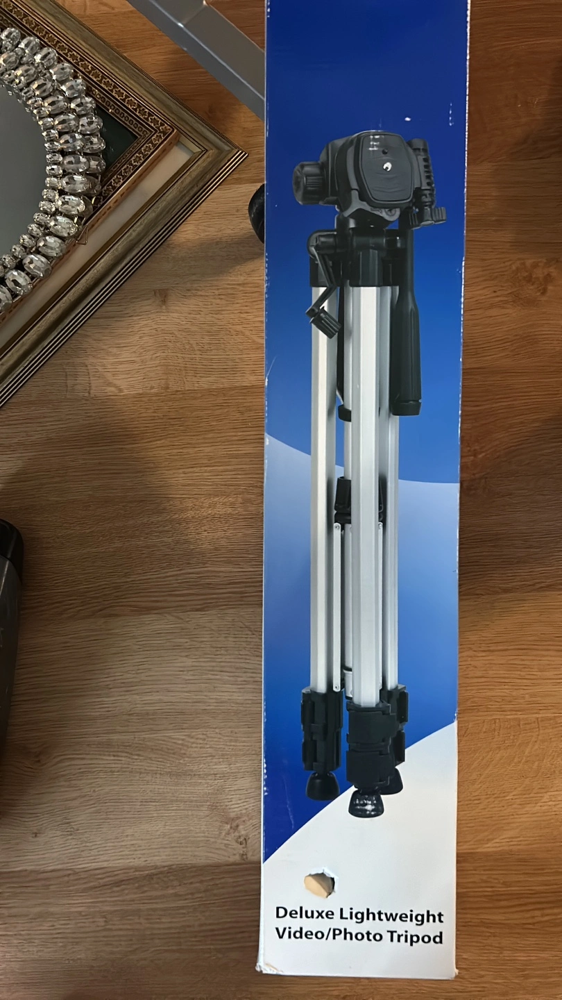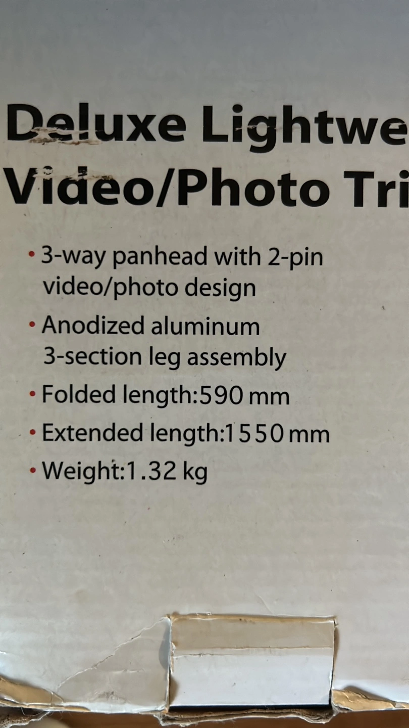 New in box, used once. Lightweight aluminum tripod. Features 3-way panhead, 2-pin video/photo design. Folded length: 590 mm. Extended length: 1550 mm. Weight: 1.32 kg.
