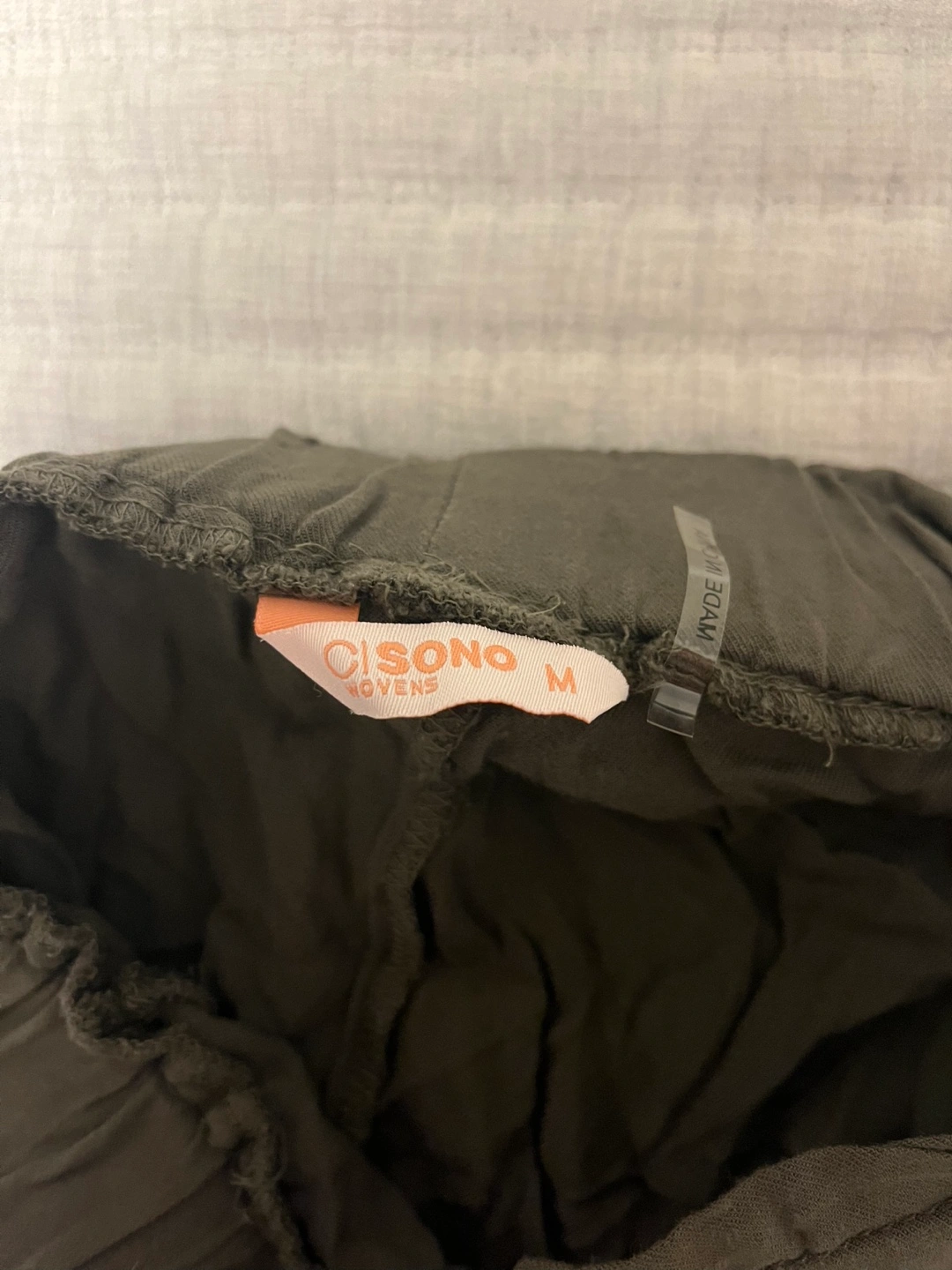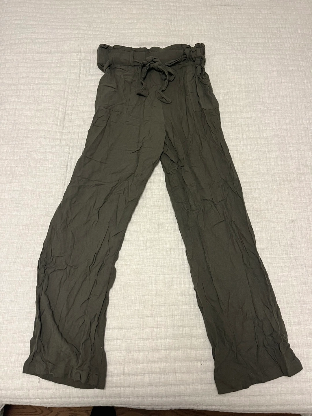 Olive green paper bag waist pants. Size medium. Wide leg. Elastic waistband with drawstring. Two pockets.