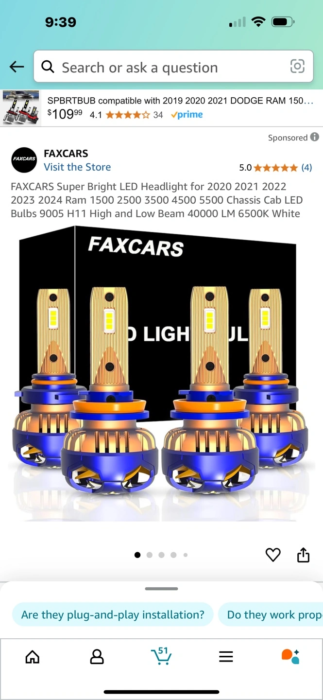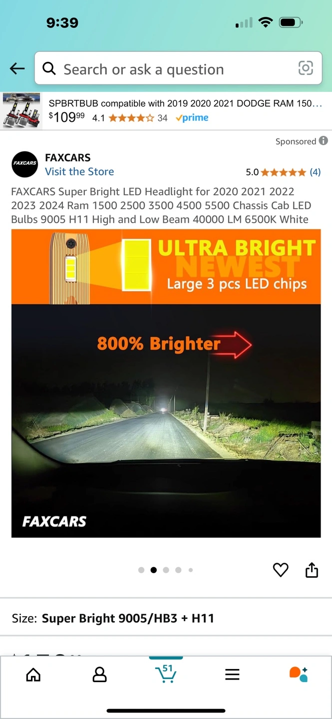 Super bright LED headlight bulbs. Compatible with 2020-2022 Dodge Ram 1500, 2500, 3500, 4500, and 5500 models. Three large LED chips per bulb. 40000 LM 6500K White. Includes 9005, HB3, and H11 sizes.