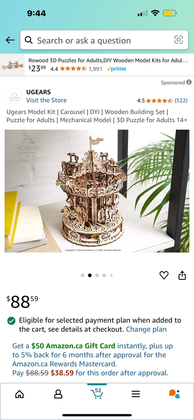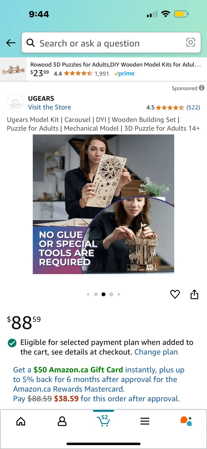 85Assemble a beautiful carousel. 3D wooden puzzle. No glue or special tools required. For ages 14+. 305 pieces. Approximately 6 hours assembly time.