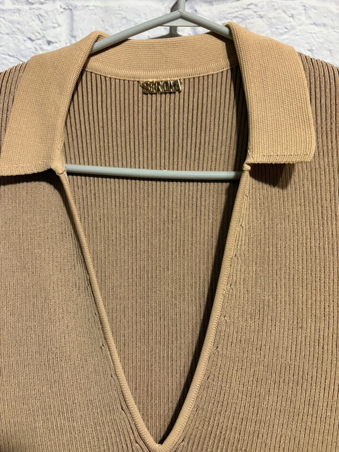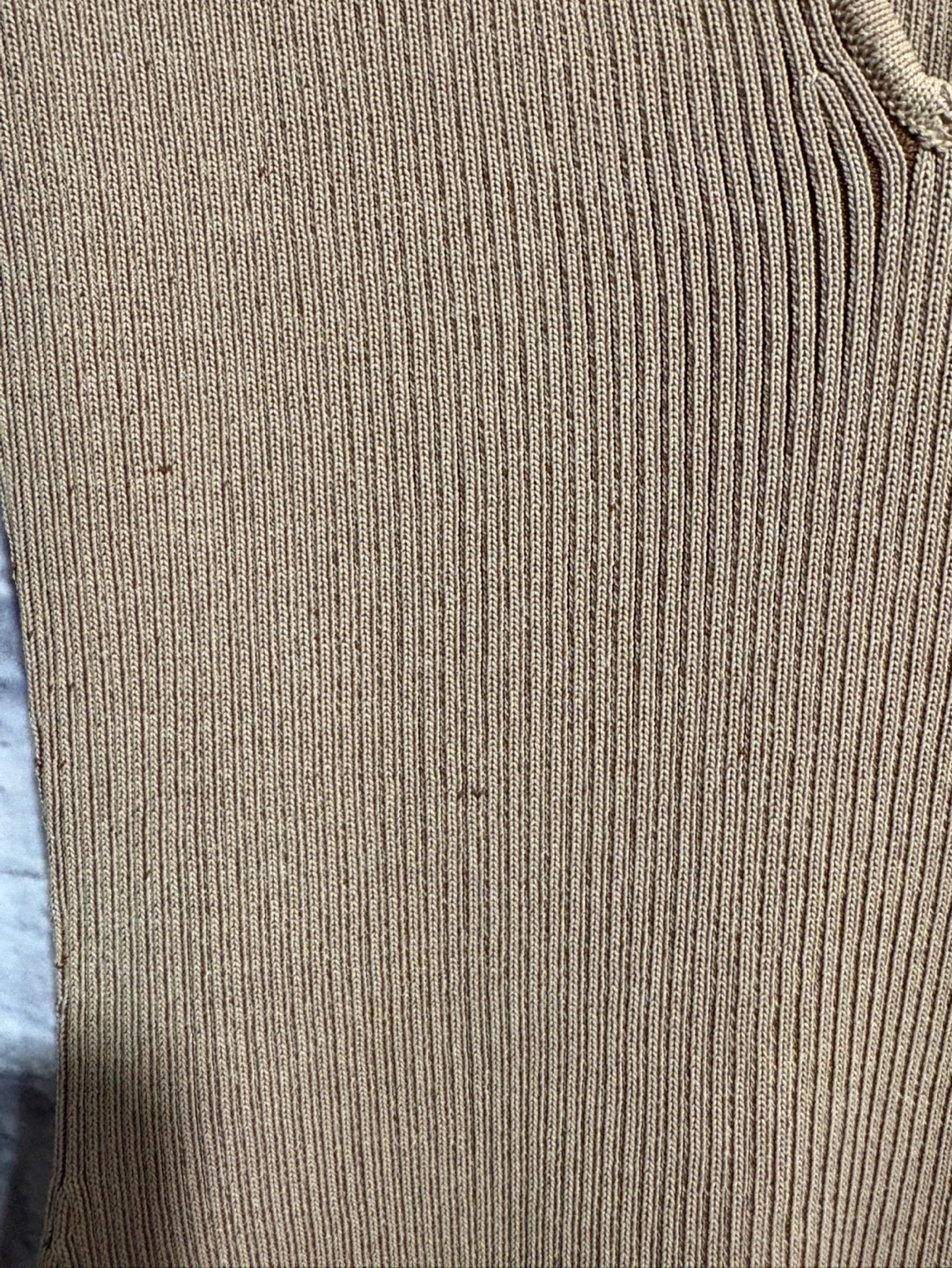 Beige ribbed knit mini dress. Long sleeves, V-neck, collared neckline. Form-fitting. Size Medium. 93% nylon, 7% spandex. Retail is $410 plus tax, sold out style. Pick up only.