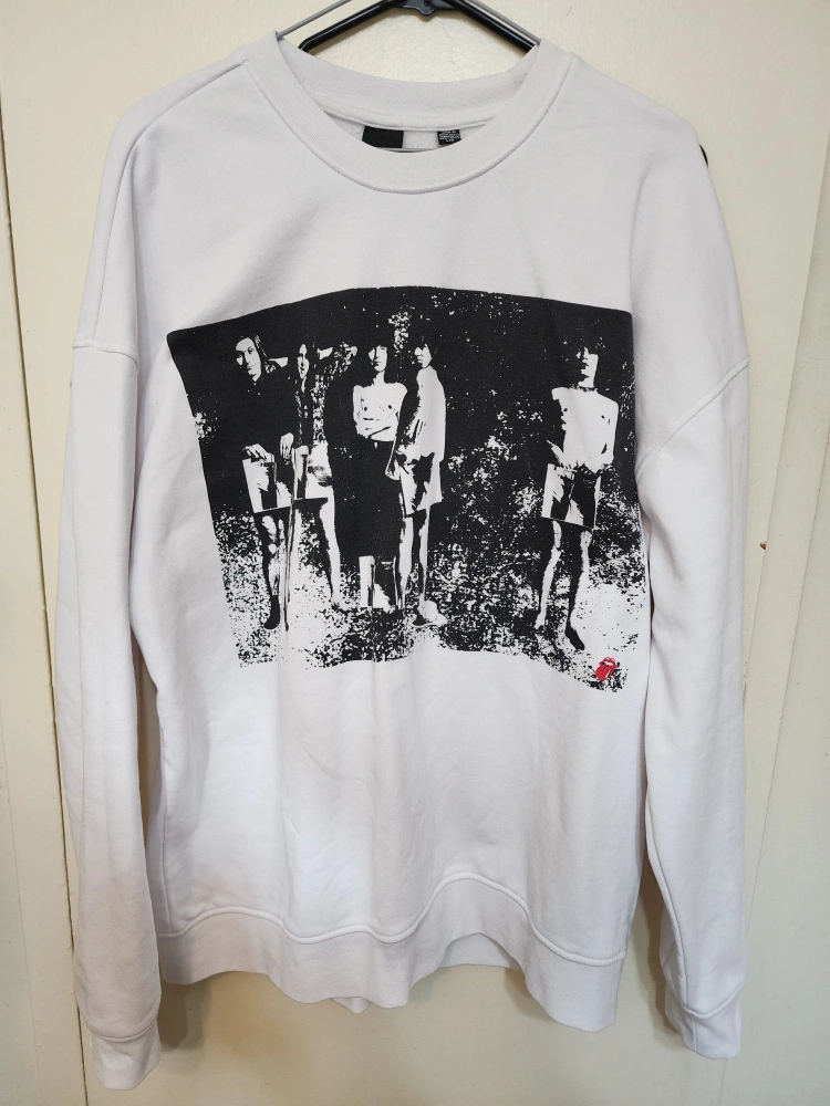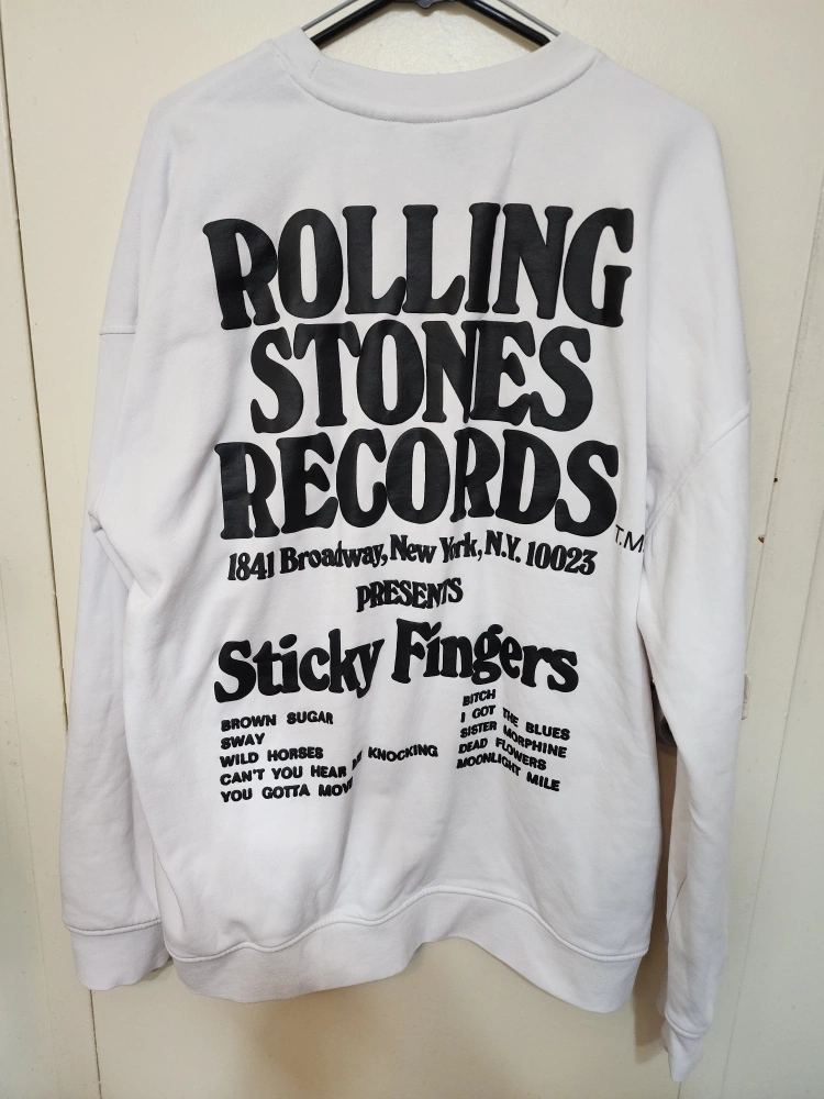 Used, never worn. White crewneck sweatshirt. Features a Rolling Stones Sticky Fingers album cover graphic on the front and back. Size large.