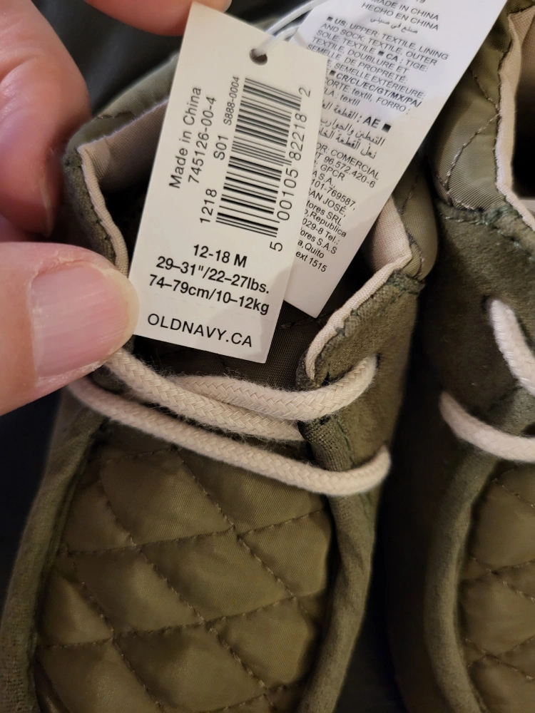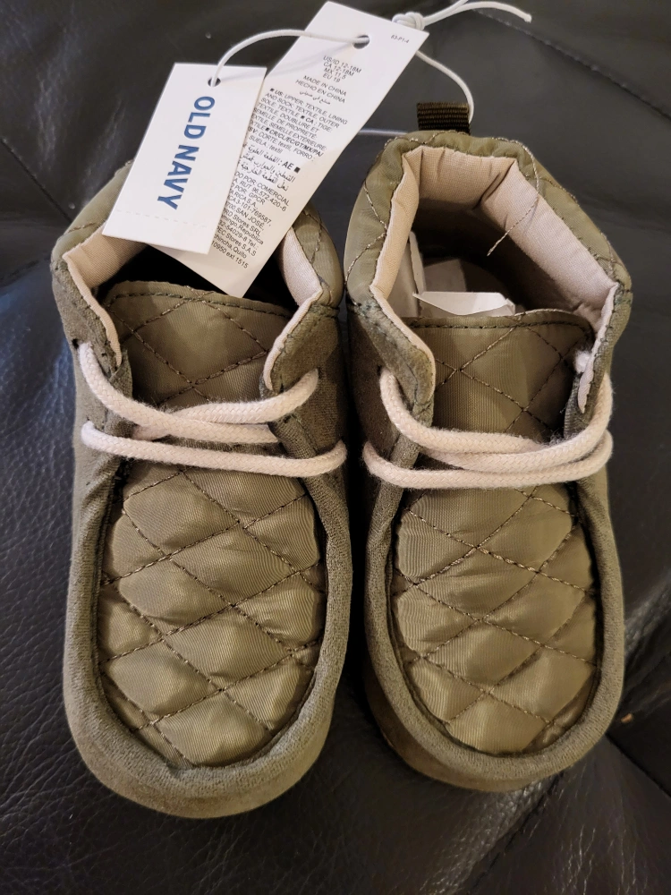 573Adorable olive green baby shoes. Soft quilted material. Size 12-18 months (29-31/22 lbs, 74-79cm/10-12kg). Non-slip soles. New with tags.