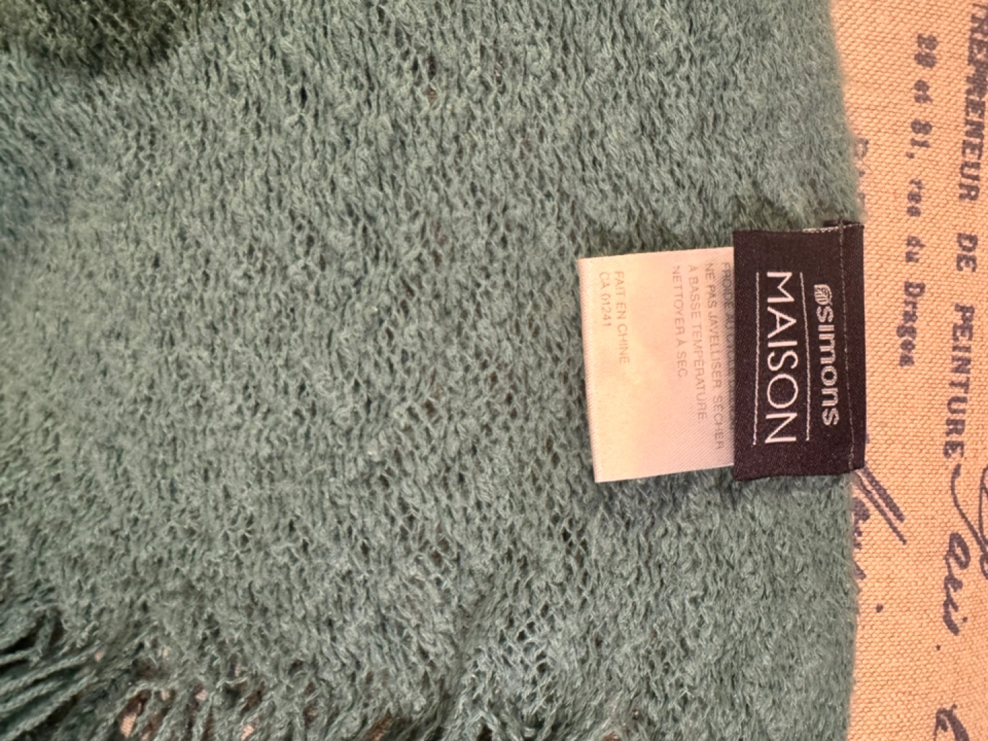 Soft teal knit throw blanket by Maison Simons. Features a textured pattern and long fringe tassels. Perfect for adding warmth and style to your living space. In perfect condition.