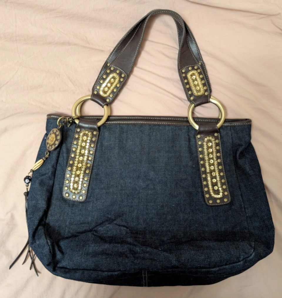 Dark wash denim tote bag. Brown vegan leather accents. Gold sequin and stud detailing. Interior features zippered pocket and multiple slip pockets. Unique charm attached.