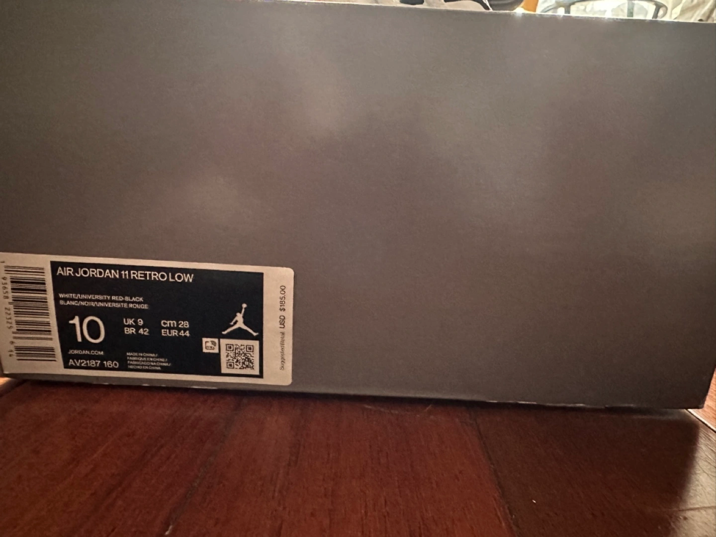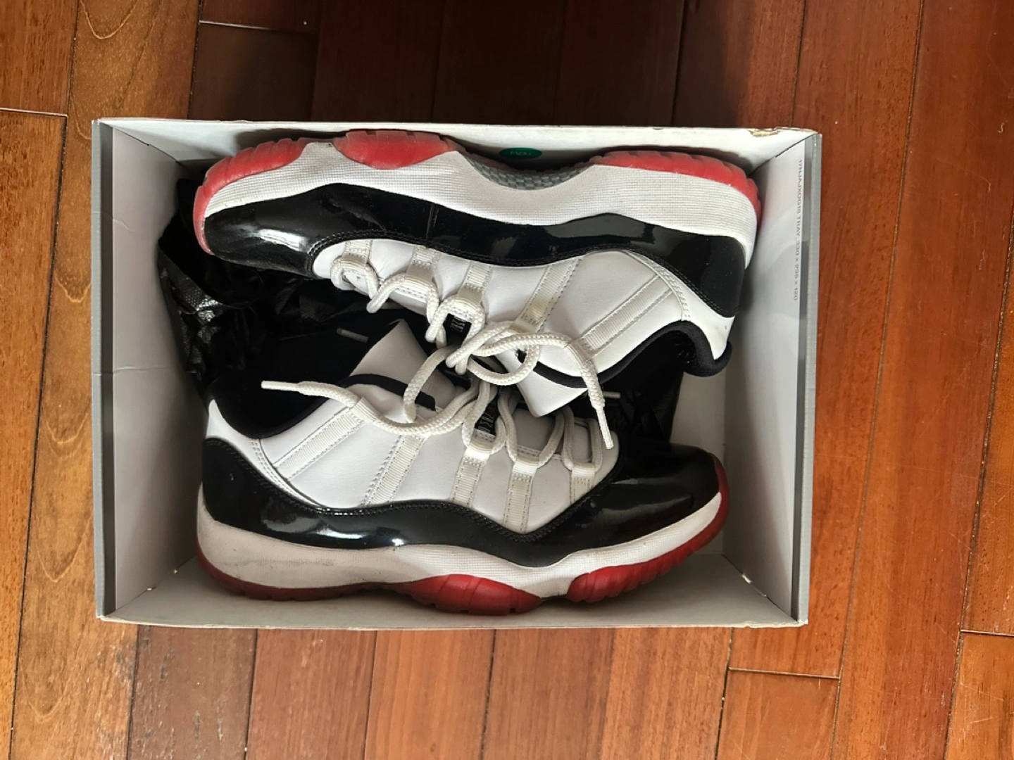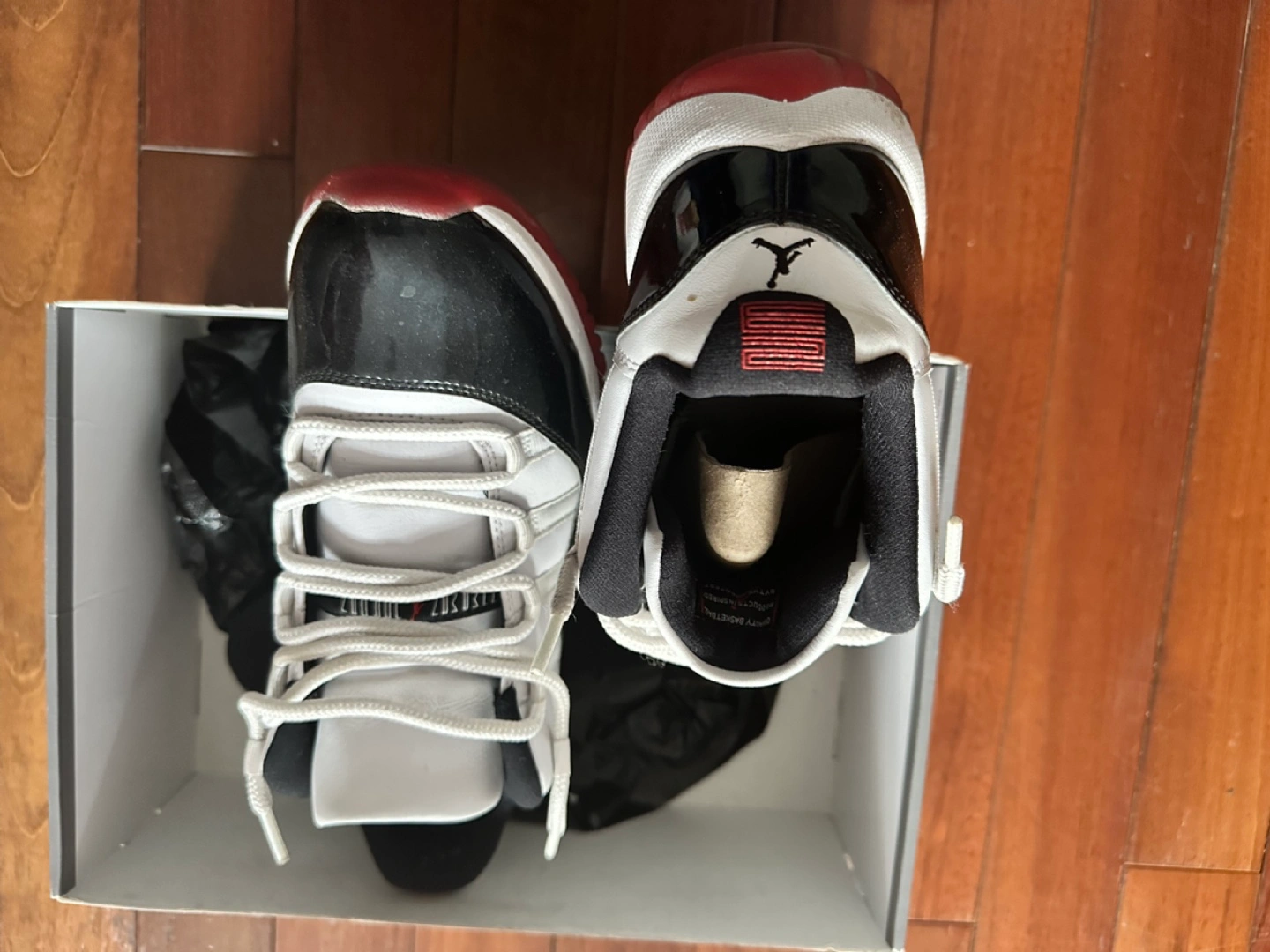 Air Jordan 11 Retro Low sneakers. Size 10. White, black, and red colorway. In original box. Pre-owned.