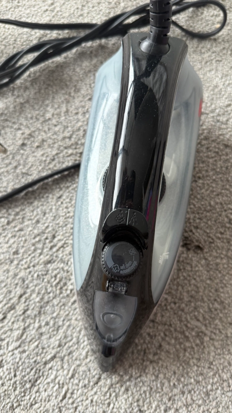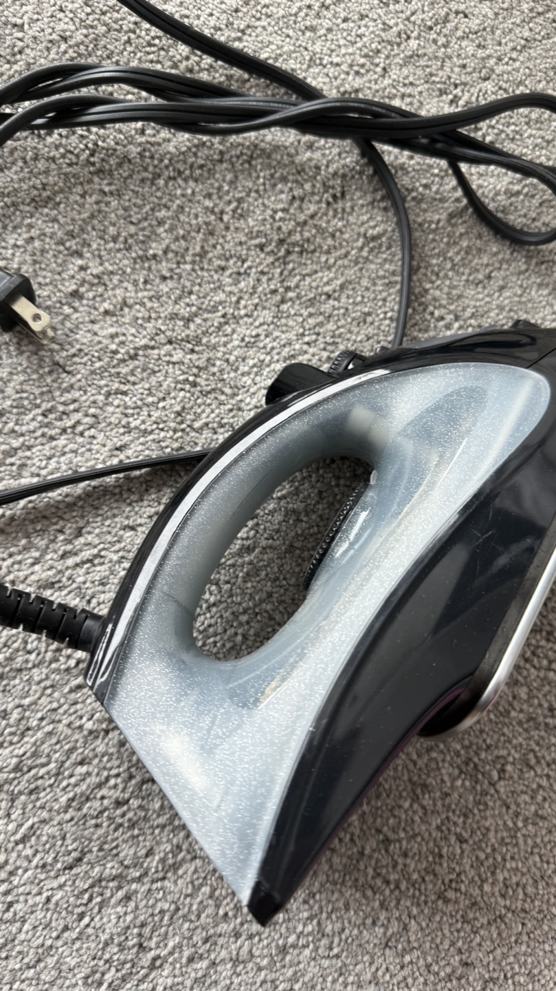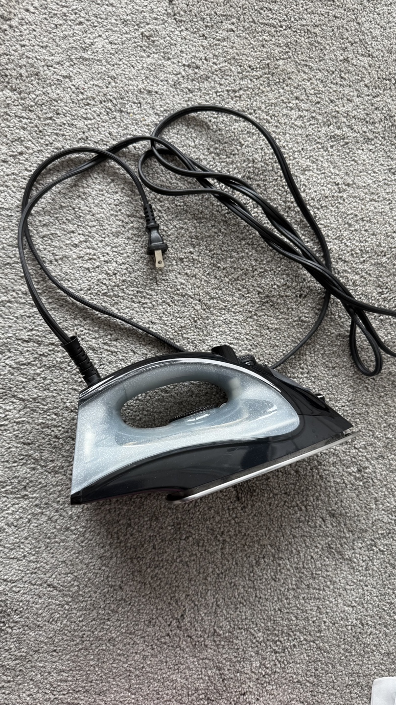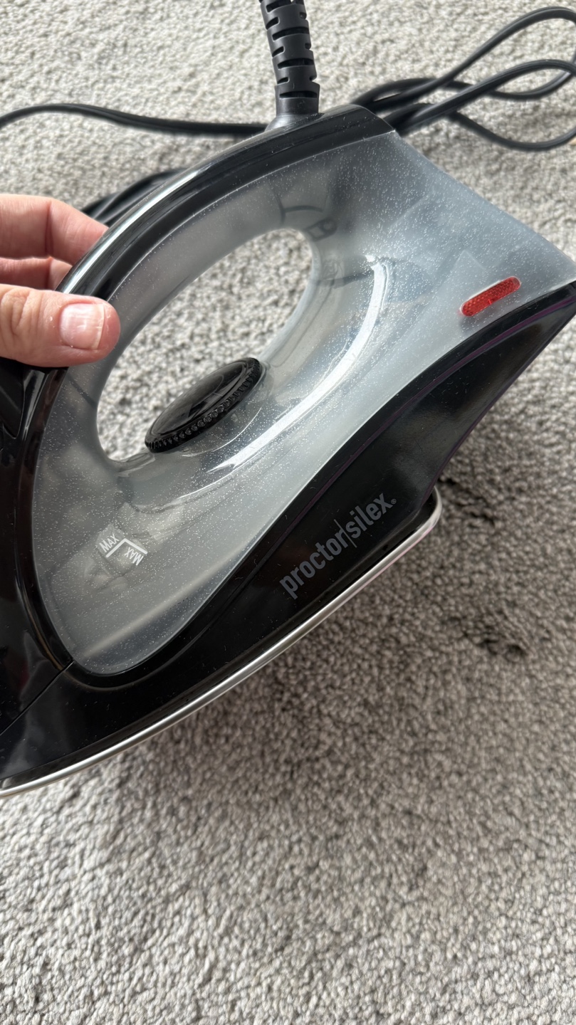 Used Proctor Silex steam iron. Black and clear body. Features a dial temperature control. Long power cord.