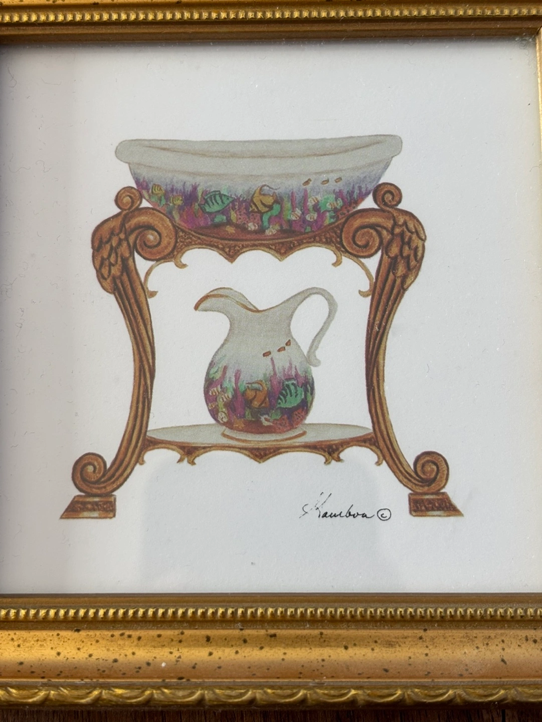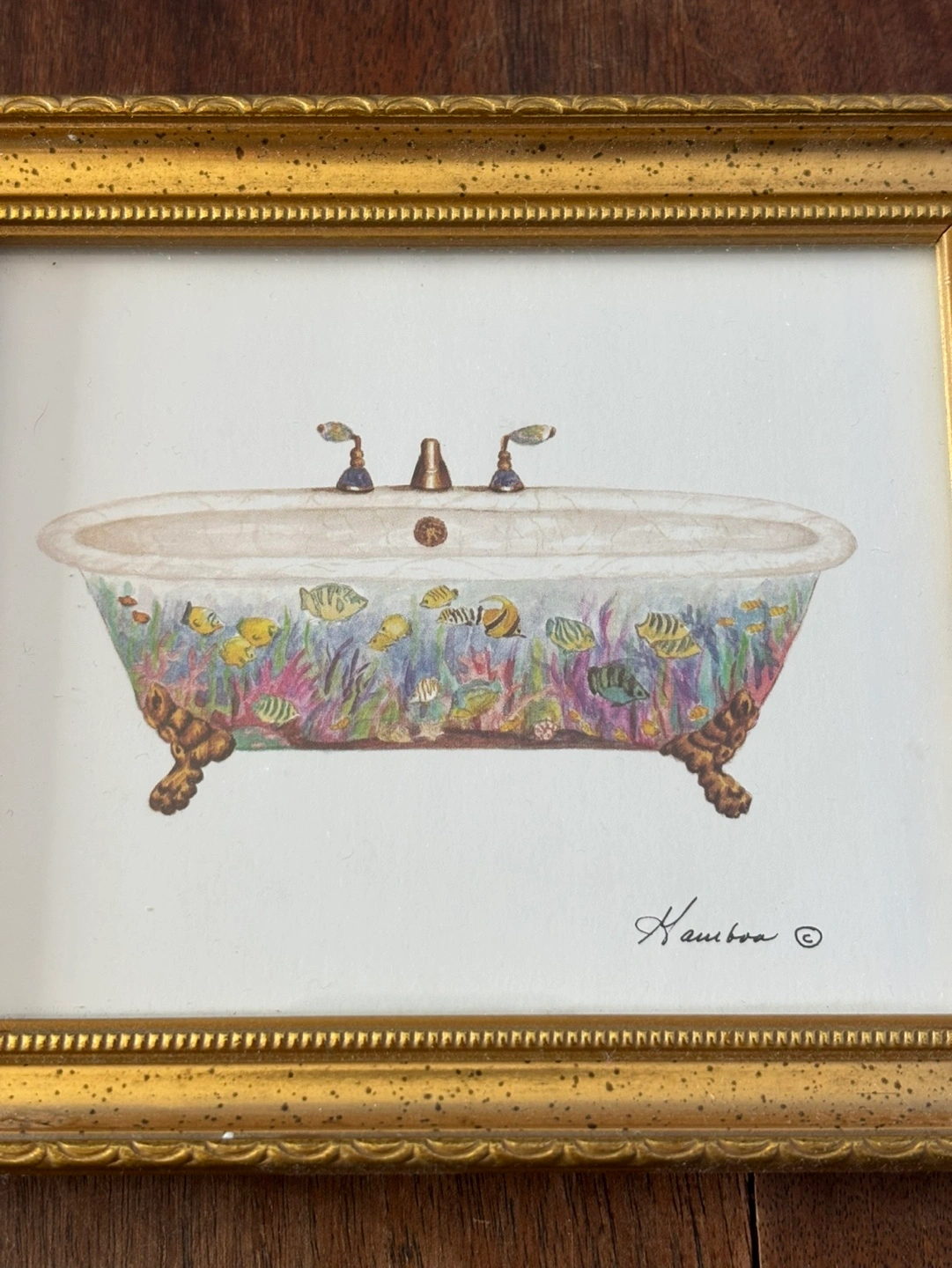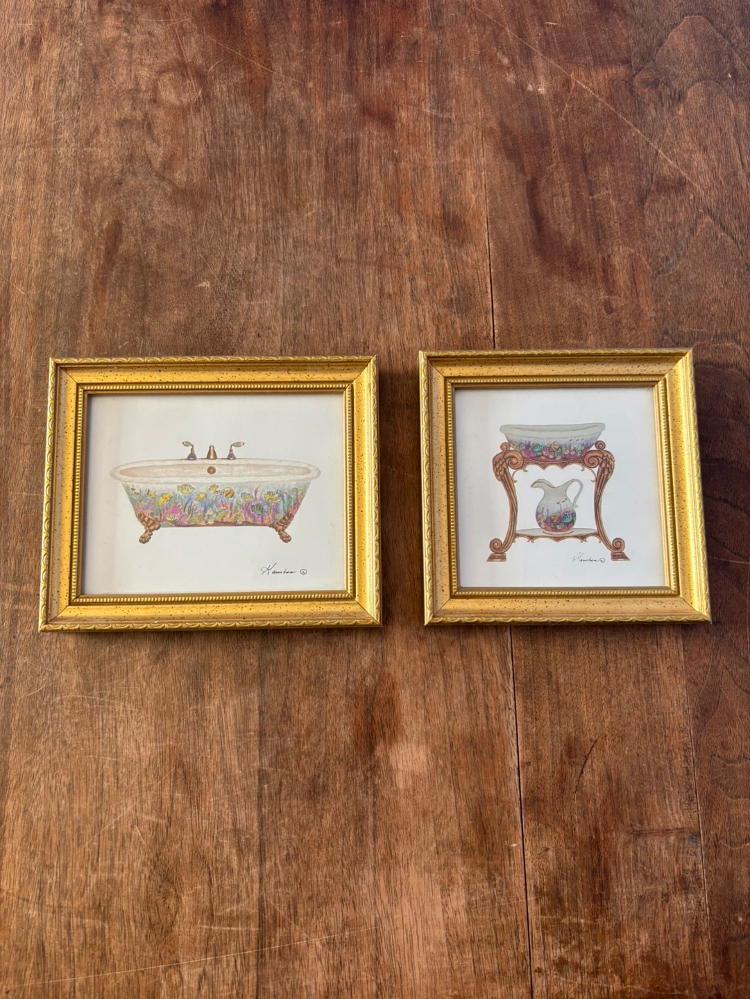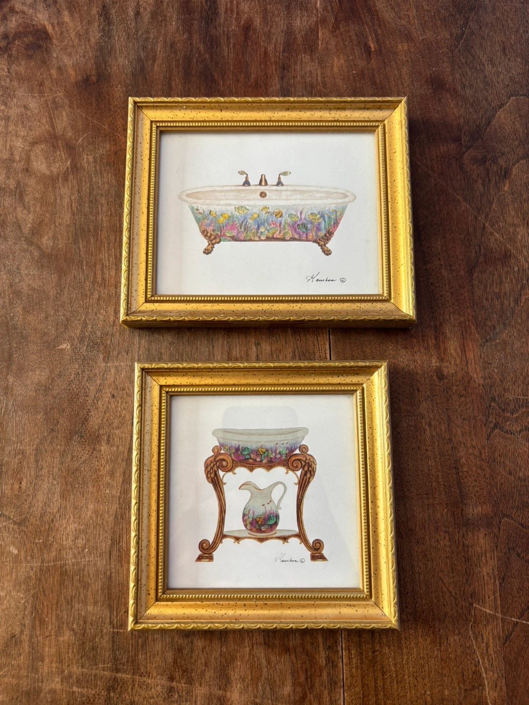 145Two Consuelo Gamboa framed artworks. Comes with a clawfoot bathtub (6x5”) and a wash basin and pitcher (5x5”) artworks. Selling as a pair