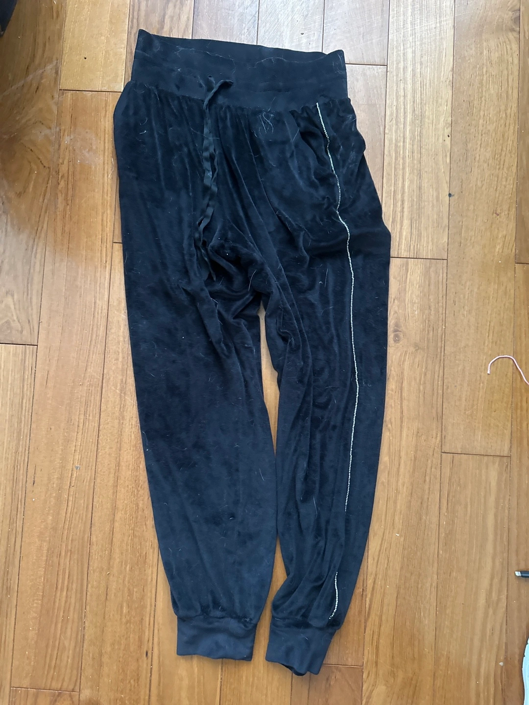 Black velvet pants. XS size. Drawstring waist. Rhinestone detailing on side. Made in Indonesia.