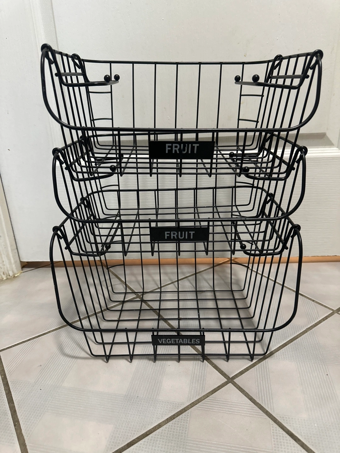 Three black wire baskets, stackable. Labels indicate use for fruit and vegetables. Great for kitchen organization.