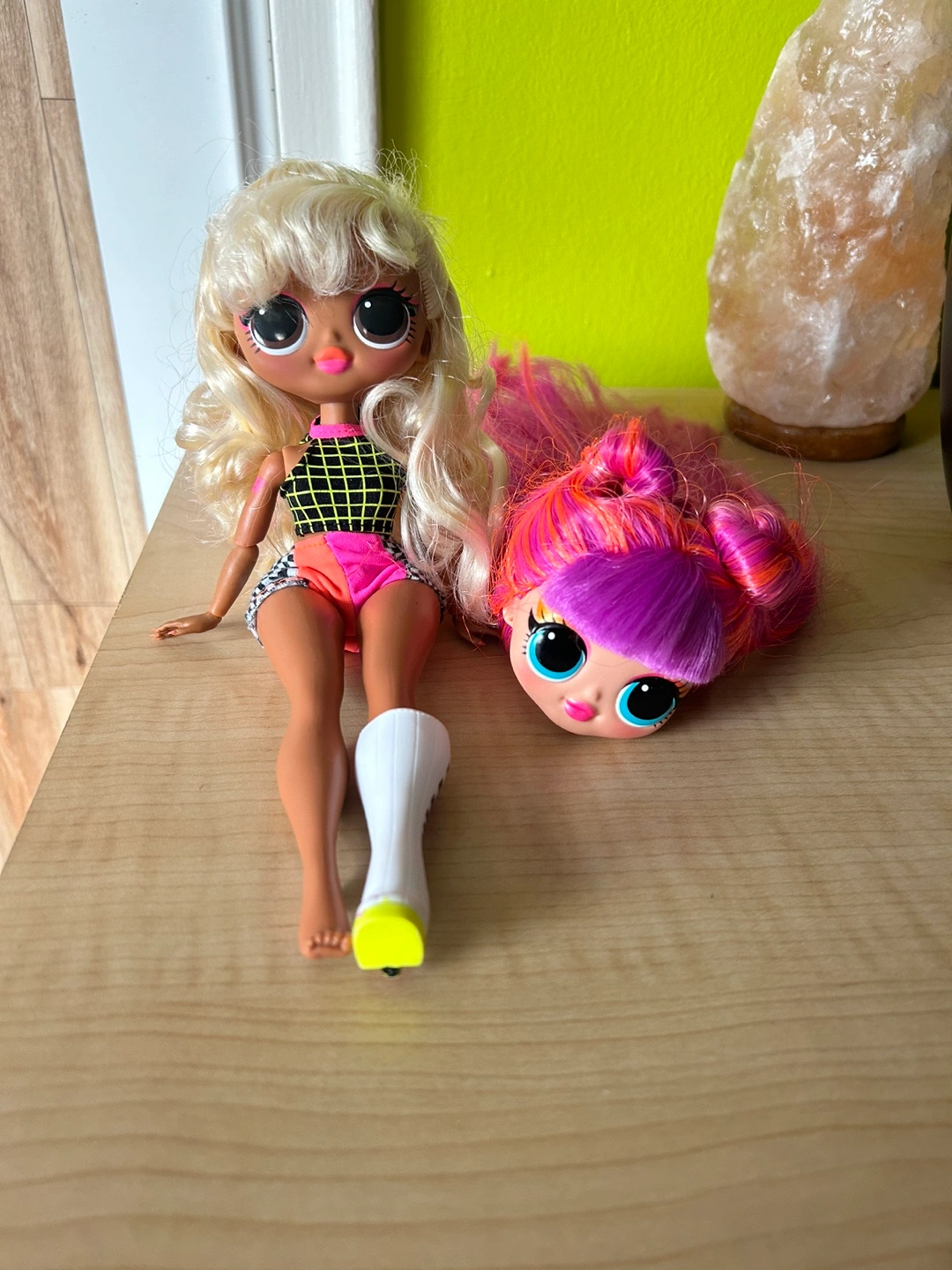 One doll has blonde hair and a neon outfit. The other doll's head is detached, and it has purple and orange hair. I have another head of Remix Fame Queen I can include at no cost- please remind me!