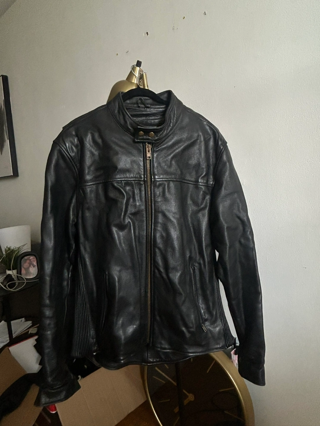 Classic black leather motorcycle jacket. Full zip closure. Features ribbed accents at the sides. Pockets included. Great for colder weather. This is very heavy.