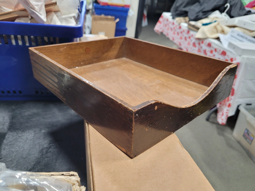 nice inbox for desk top. Antique wooden tray. Dark brown finish. Shows some wear. Could be used for organizing or decoration. Rectangular shape with a slight curve at the front. dont make them like this anymore with dove tail details!