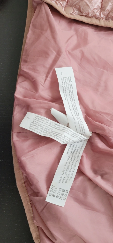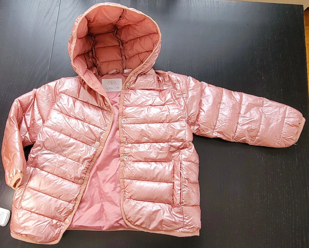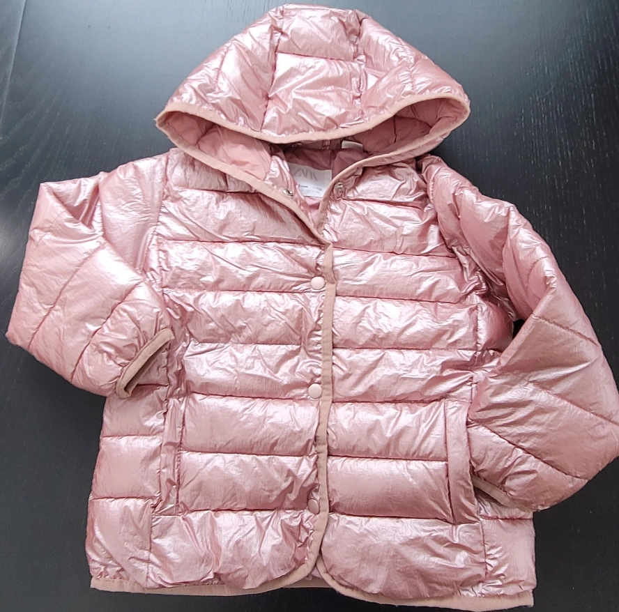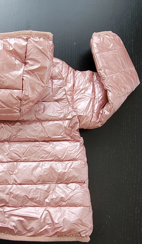 Shiny rose gold puffer jacket. Features a hood and snap button closure. Lightweight and warm. Size 4-5 years.