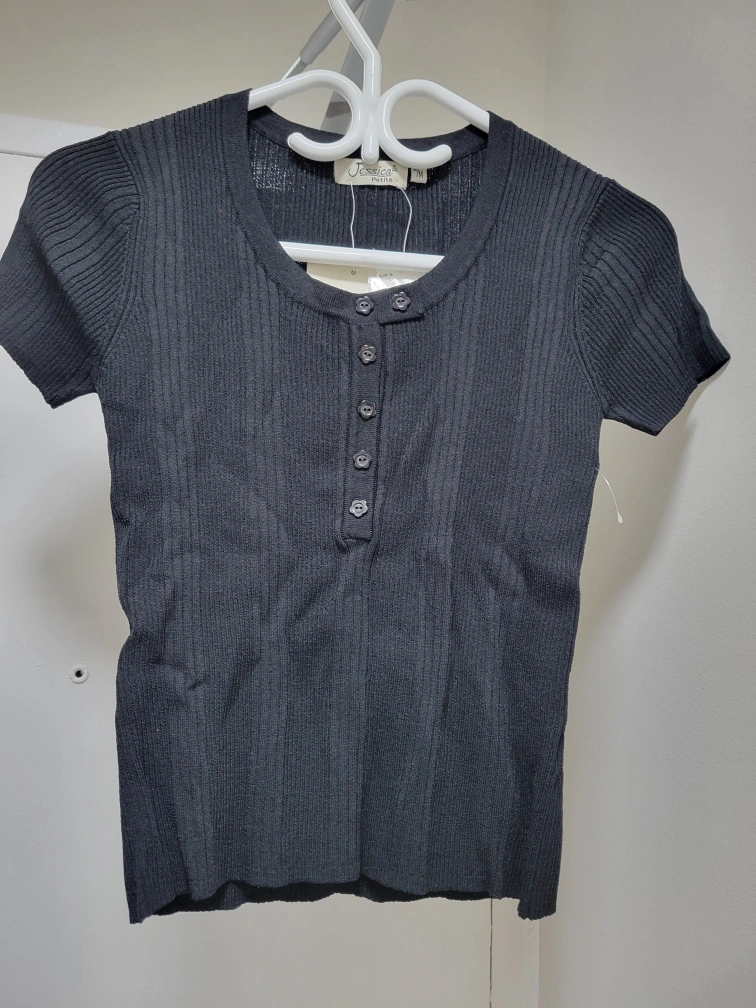 Short sleeve, black ribbed knit top. Button detail at neckline. Great for layering or wearing alone.