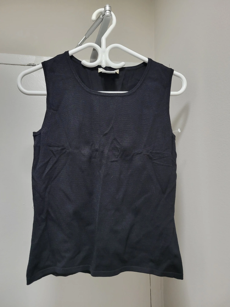 Black sleeveless top. Fabric blend: Acrylic, Wool, Rayon, Nylon, Cotton. Size Medium. Simple, classic style. Great for layering.