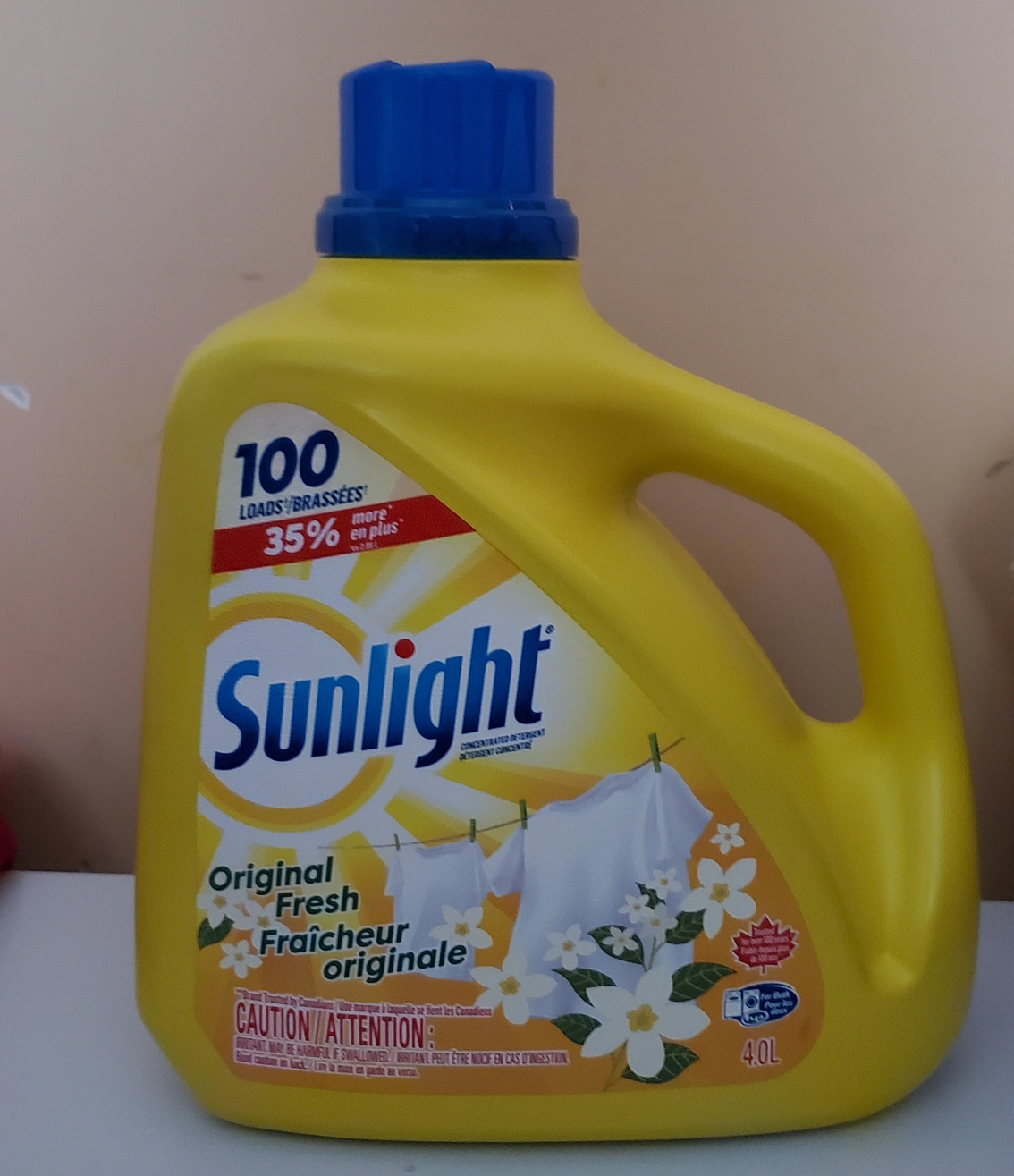 4L jug of Sunlight laundry detergent. Original Fresh scent. 100 loads. 35% more.