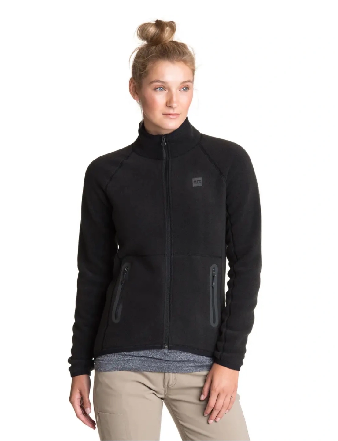MEC Ember Jacket - Women's - BNWT Size S, M & XL available (giftable) Made of heavyweight polyester fleece with a soft brushed finish on both sides High stand up collar blocks drafts and has contrast edge binding tape that is soft on skin Raglan sleeves sit well under backpack straps Simple elastic edge binding at cuffs and hem seal out drafts Zippered handwarmer pockets are glued in Curved hem is dropped in the back for coverage