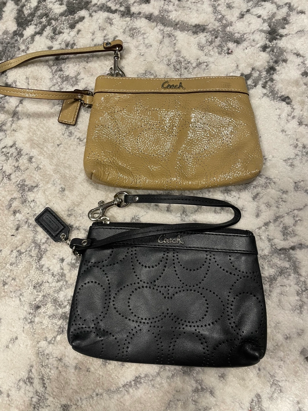 97Pair of Coach wristlets. One beige patent leather, one black leather with cut-out pattern. Both have wrist straps and zip closures.