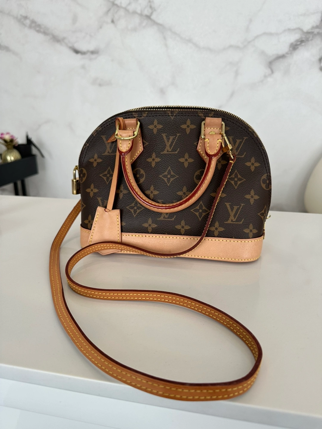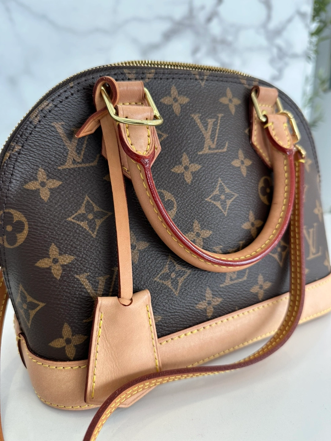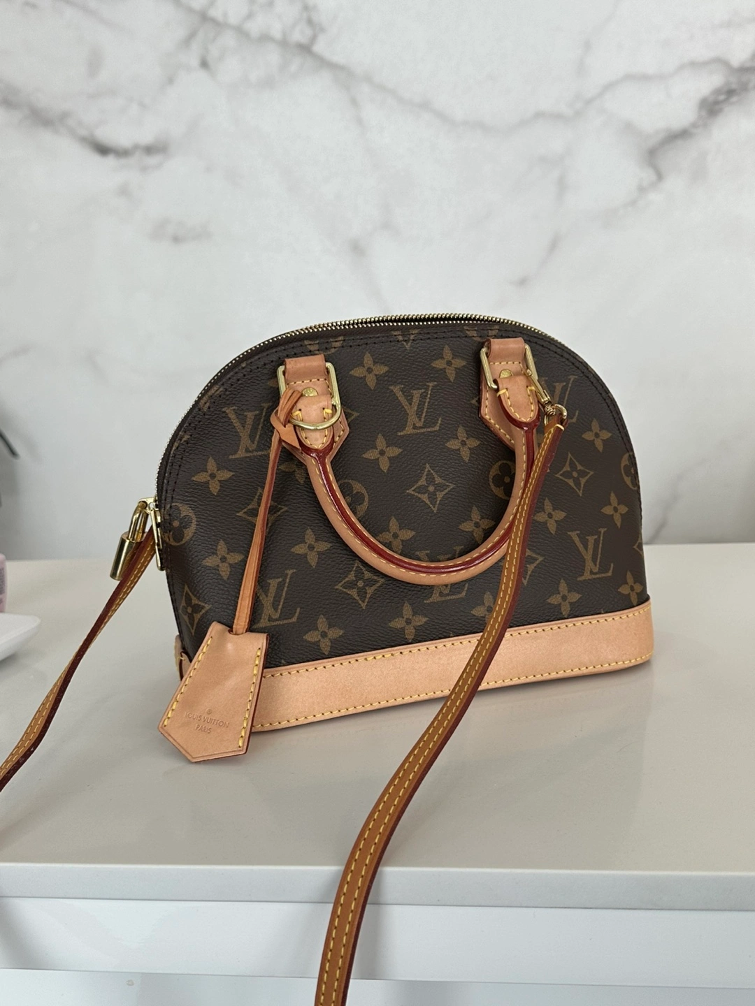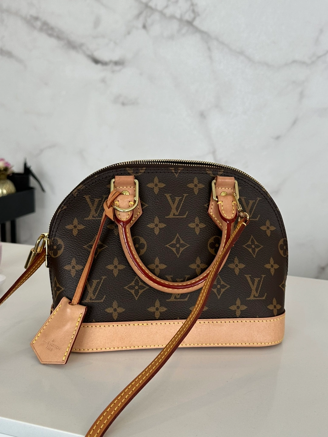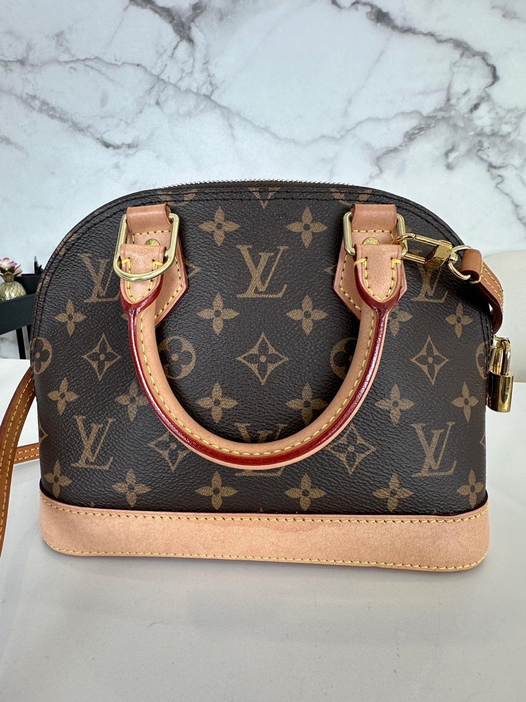Adorable mini handbag. Brown monogram canvas. Light beige leather trim. Top handle and removable strap. Gold-tone hardware. Zip closure.