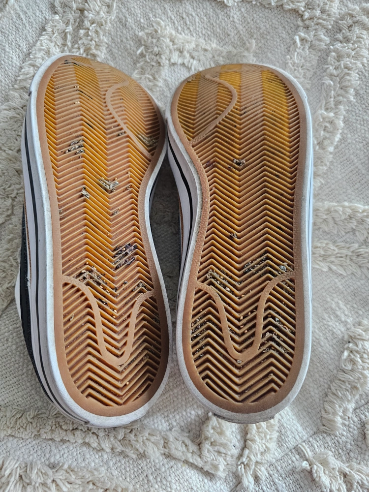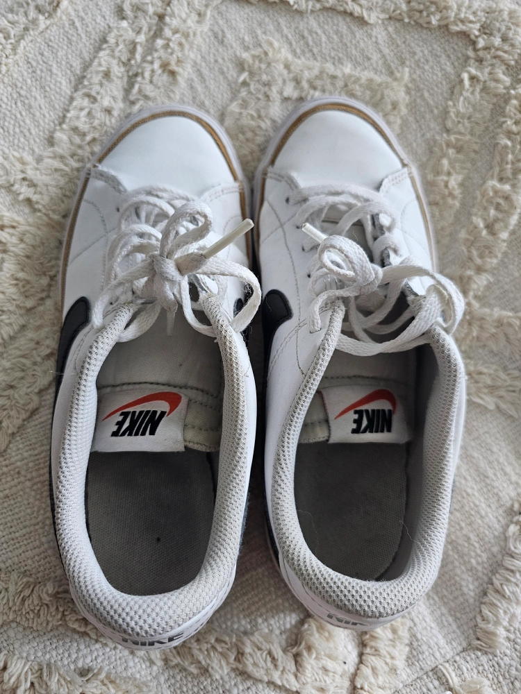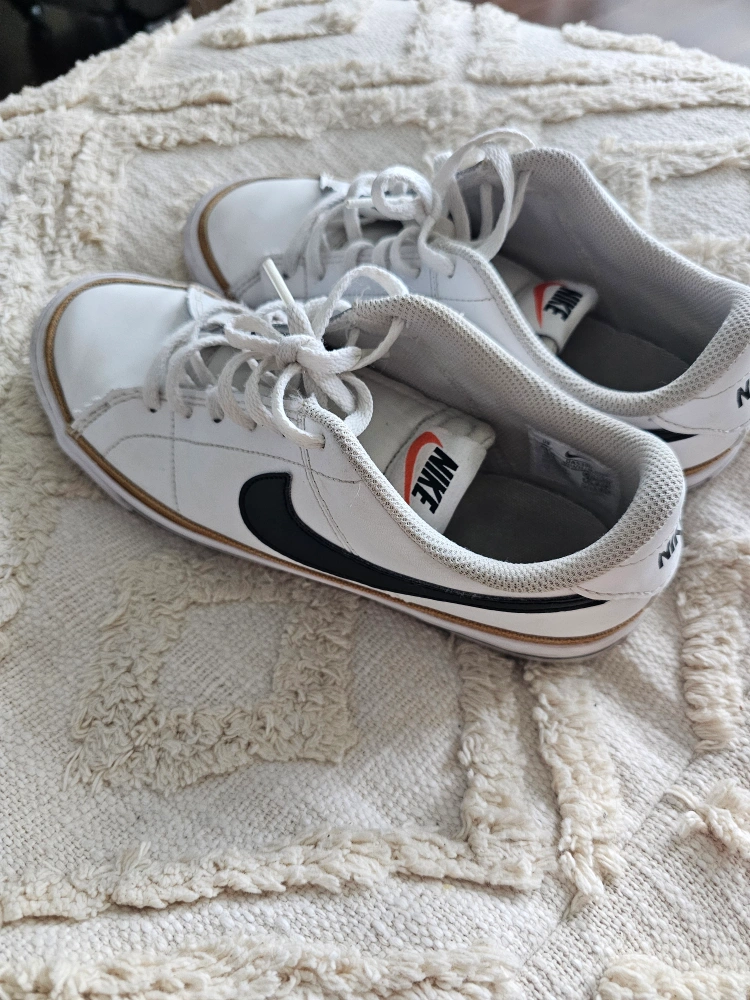272White leather sneakers with black accents. Classic design. Pre-owned, minor wear.