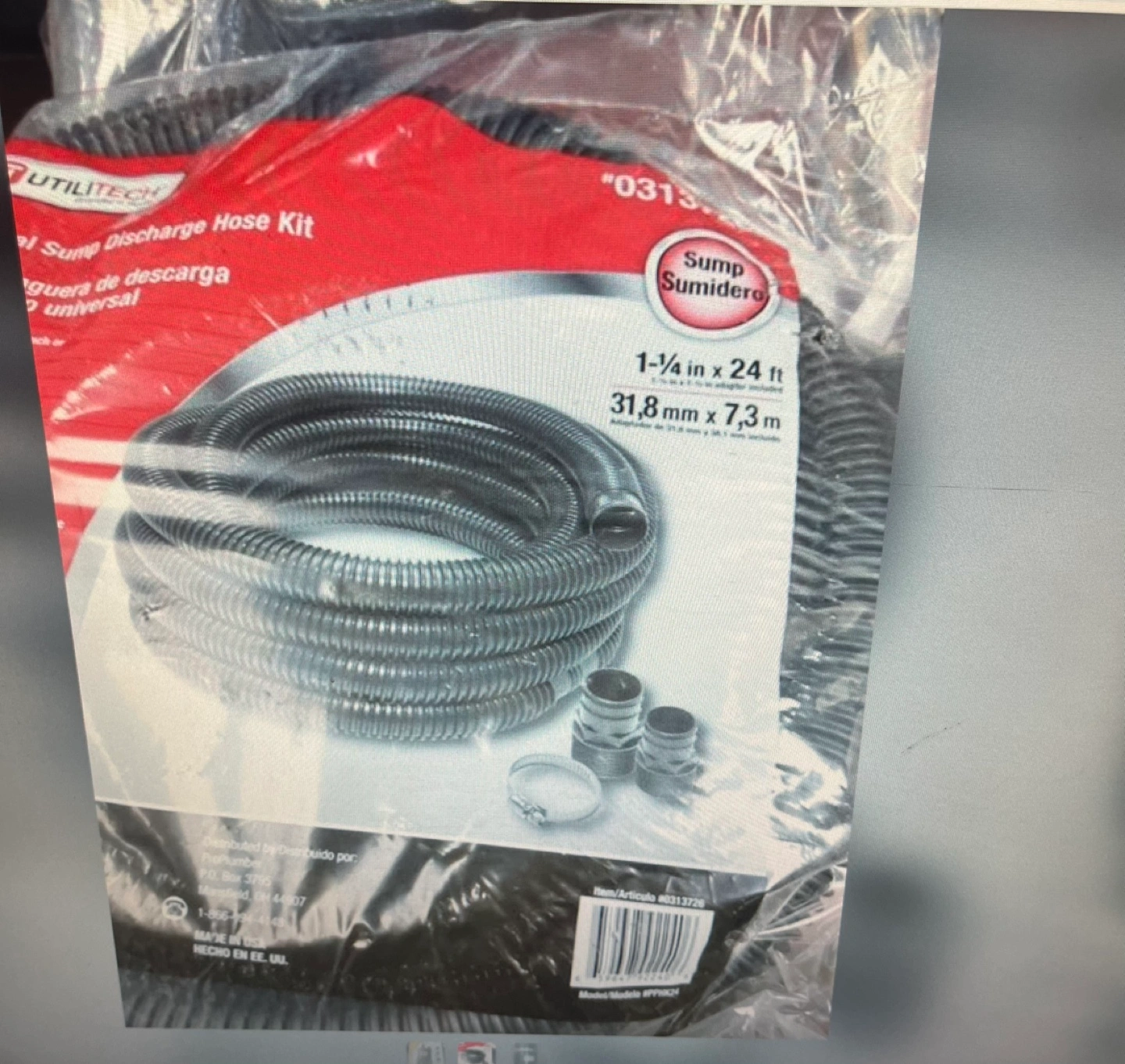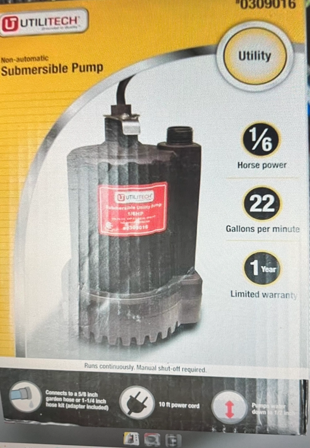 58UtiliTech submersible pump, 1/6 horsepower. Pumps 22 gallons per minute. Includes 10 ft power cord and 1-1/4 inch garden hose kit (adapter included). One-year limited warranty. Also includes flexible discharge hose.