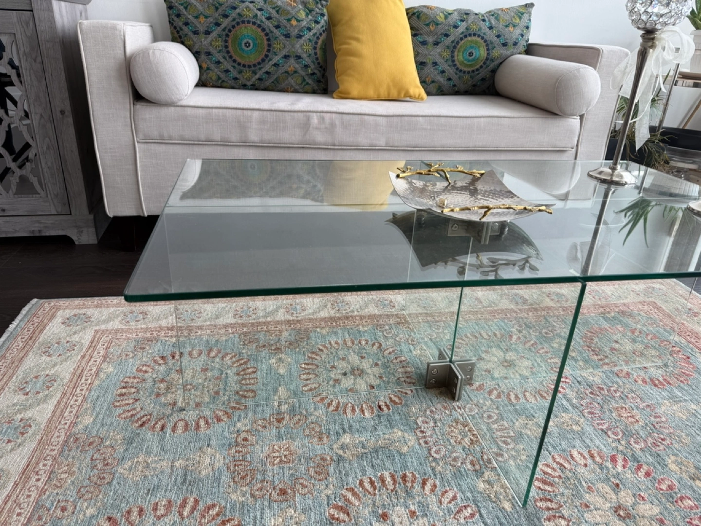 Stylish glass coffee table. Clear tempered glass top. Metal supports. Contemporary design. Great for modern living rooms.
