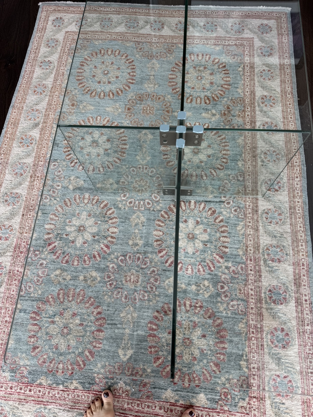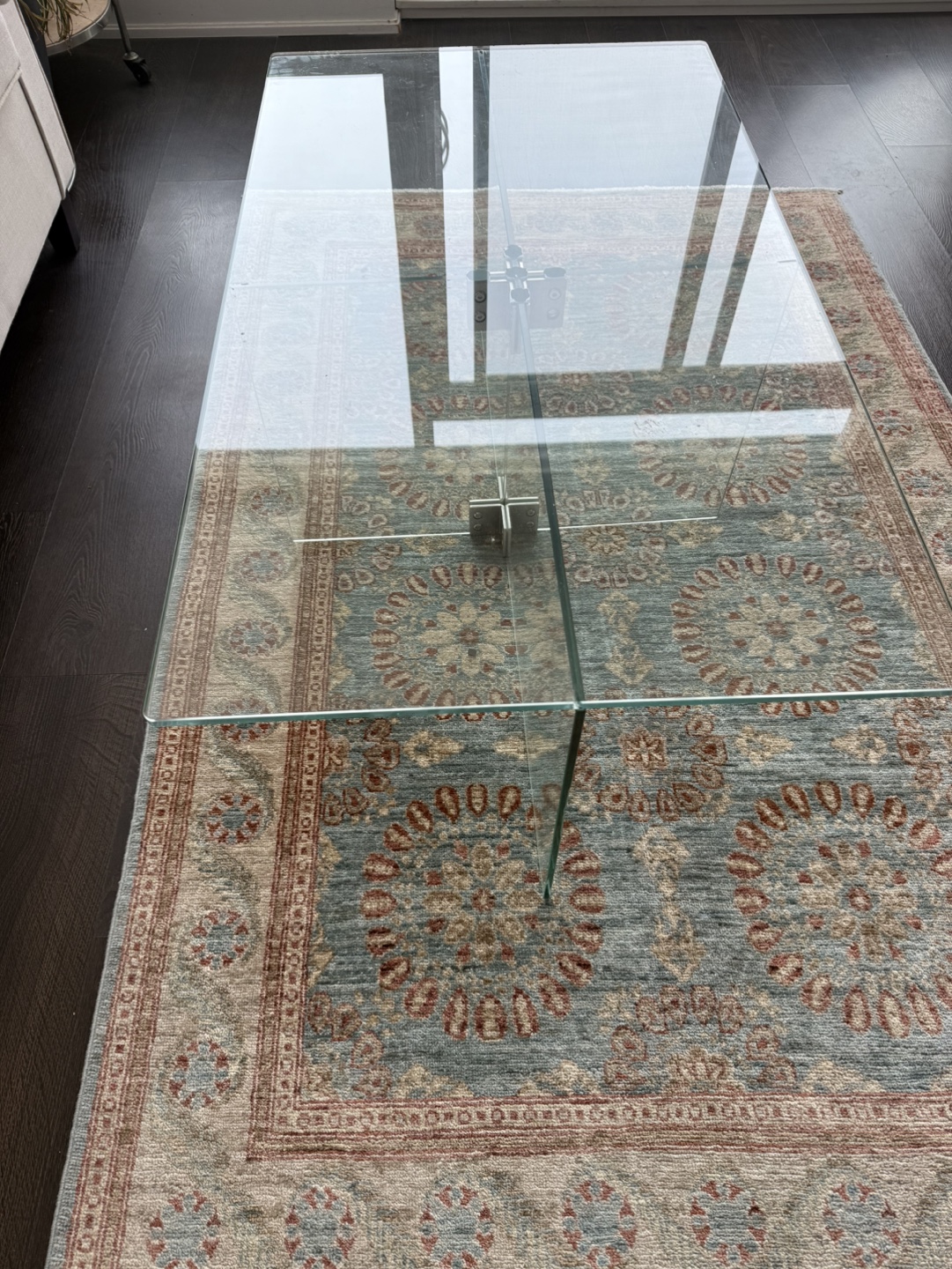 Stylish glass coffee table. Clear tempered glass top. Metal supports. Contemporary design. Great for modern living rooms.