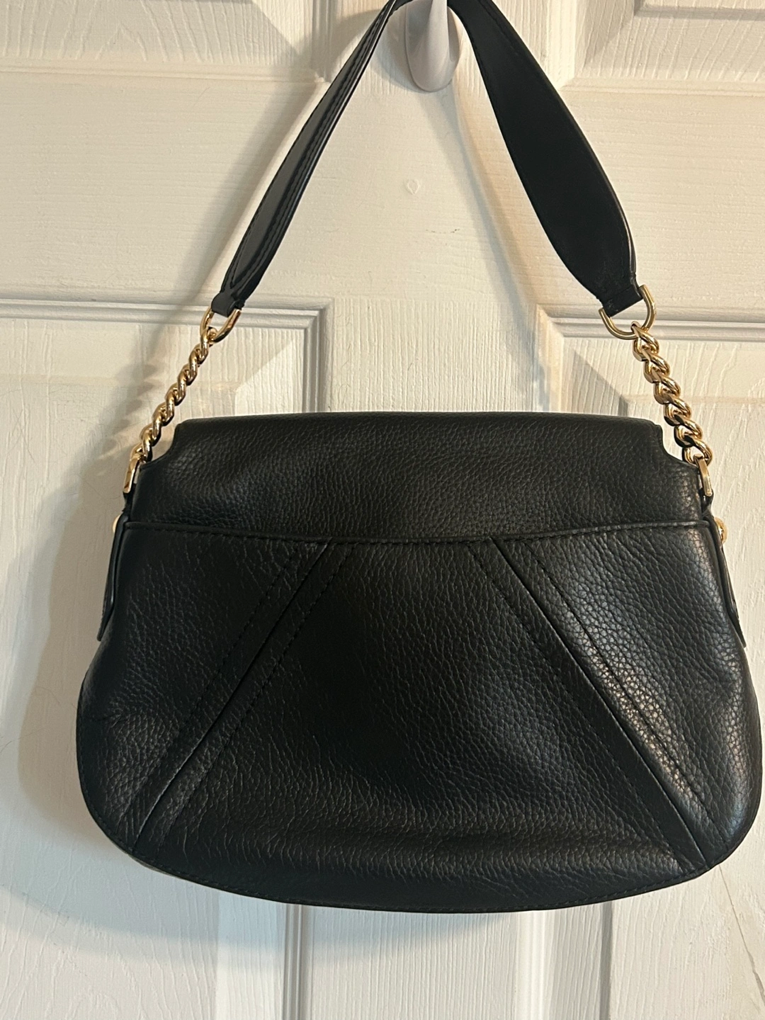 354FIRM PRICE Black leather shoulder bag. Gold hardware. Chain and leather strap. Zipper closure. Interior lining. Pre-owned.