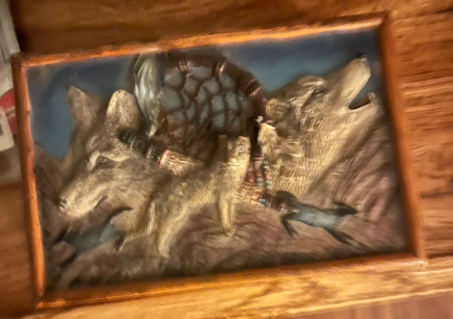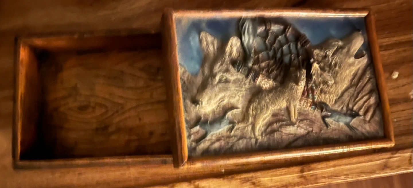 58Small wooden box featuring carved wolf artwork. Nice detail. Perfect for trinkets or jewellery. Unique piece.
