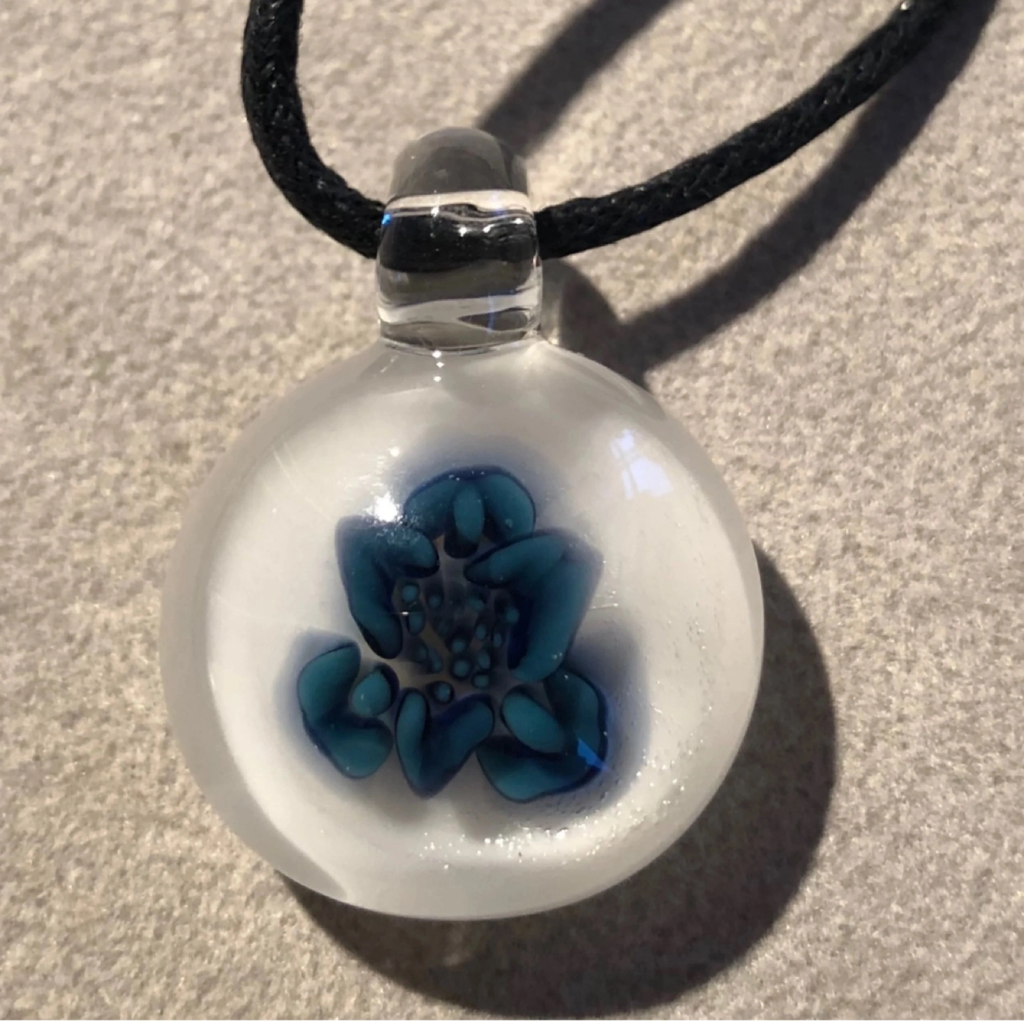 This unique piece features a 3D blue flower with a pure white background. The glass measures approximately 28mm round, the ideal size for the perfect conversation piece!
