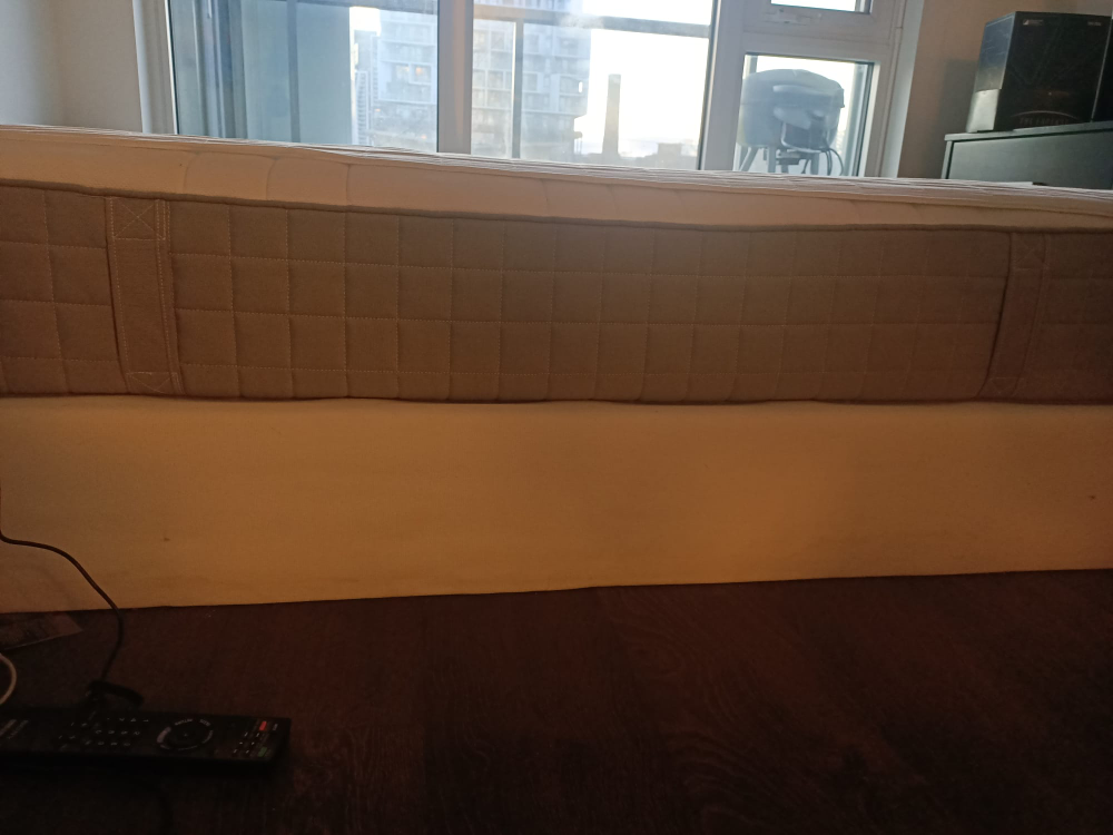Queen size mattress and box spring frame. Beige fabric frame. Mattress has a light beige quilted top (topper). Pickup only. Can be sold separately