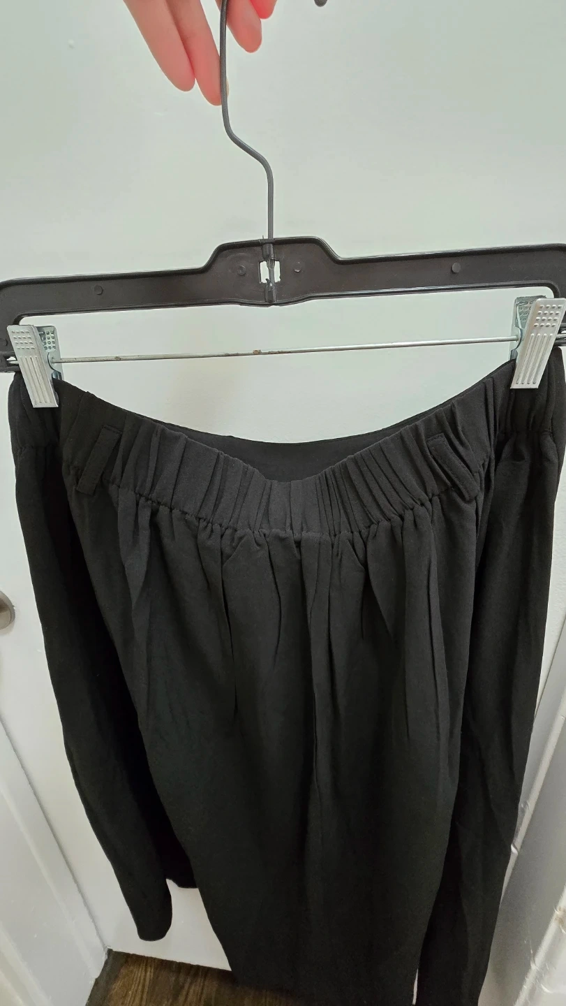 This black skirt comes with a matching belt. It features an elastic waistband and a pleated design. The fabric appears to be a polyester blend. Garterized on the back. Size large on tag.