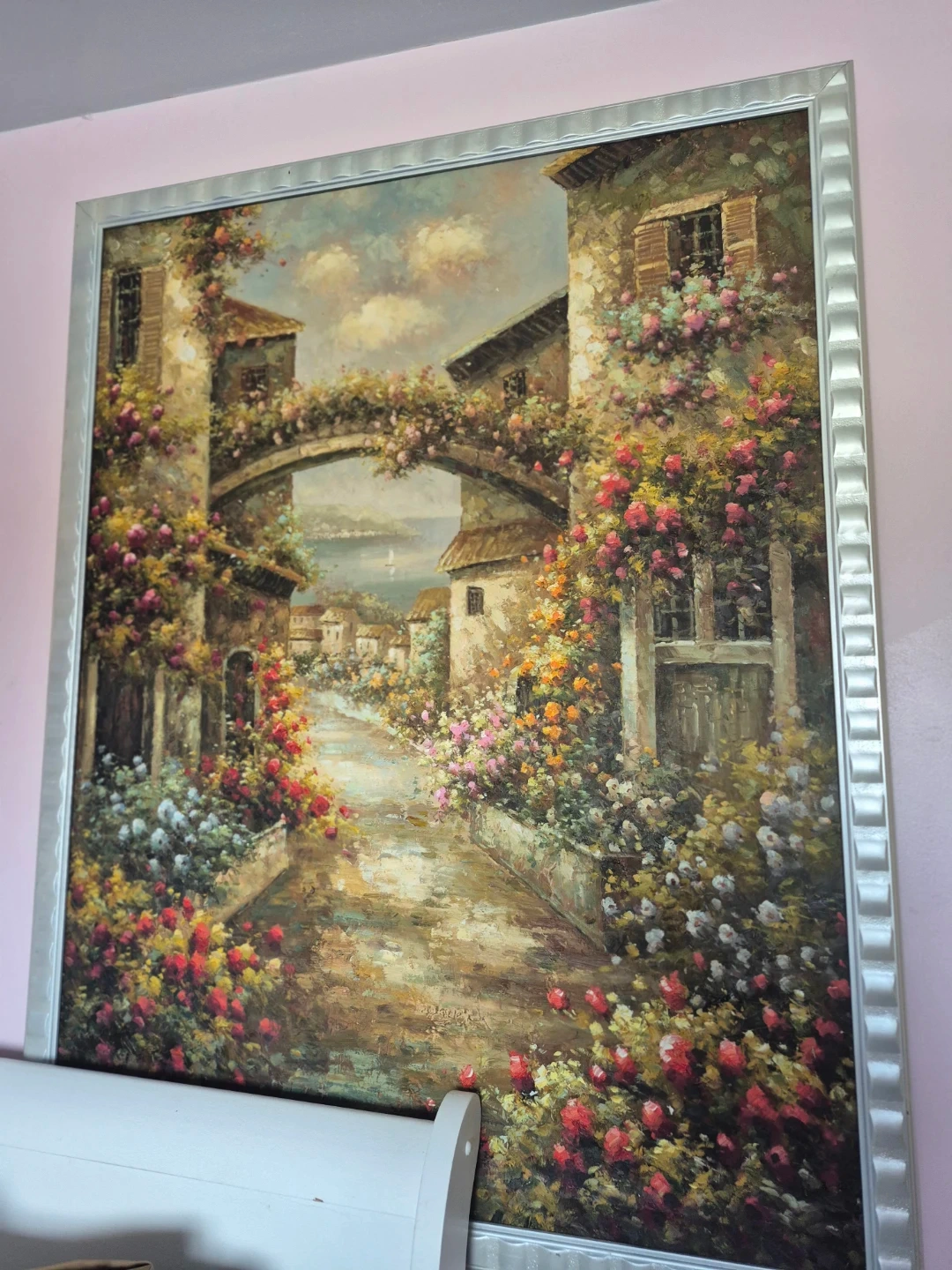 This is a beautiful framed oil painting depicting a charming European street scene with abundant flowers. It's an oil on canvas artwork. It's ready to add some colour to your space!