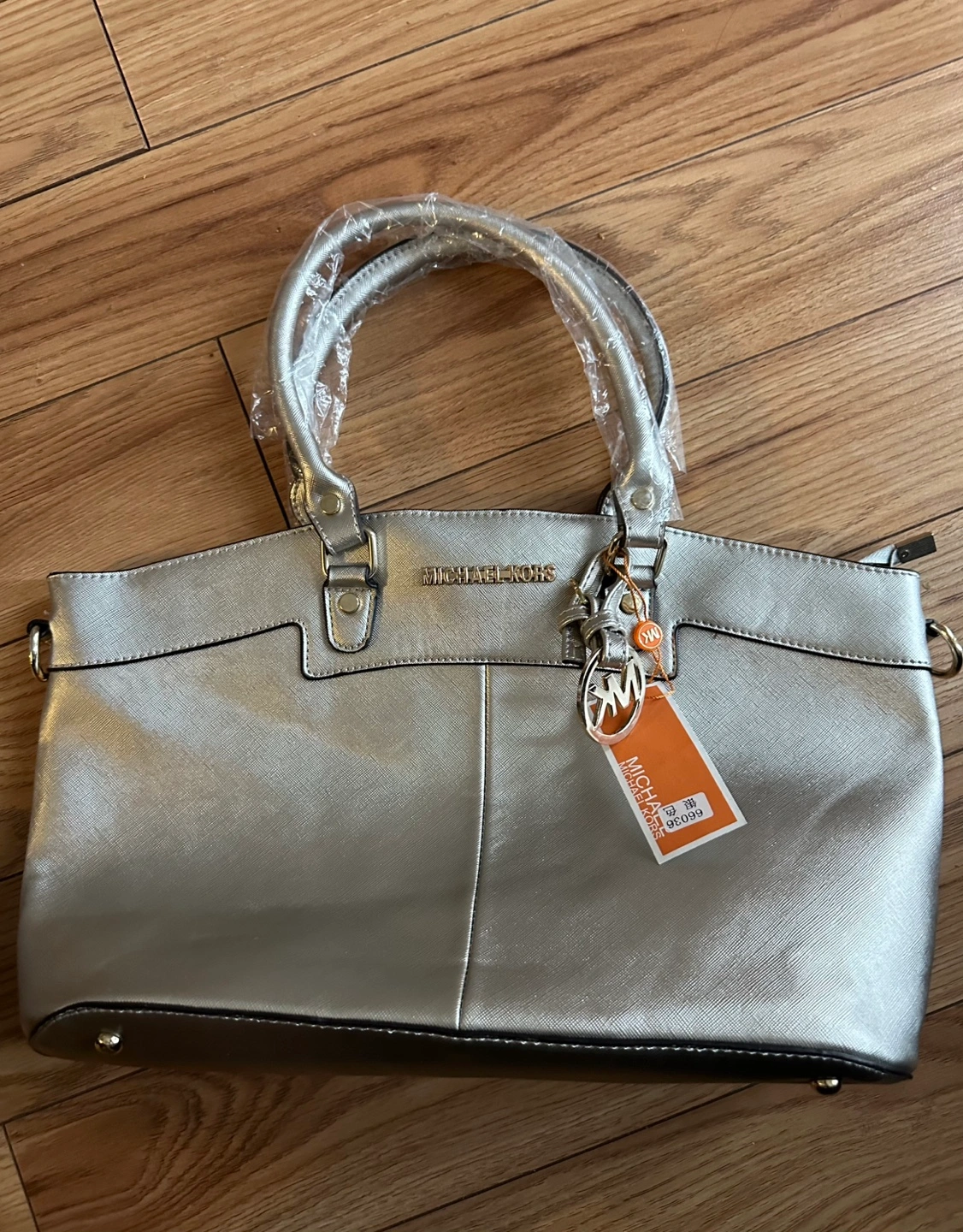 Metallic silver handbag. Double top handles. Zip closure. Comes with original tag. Stylish and elegant.