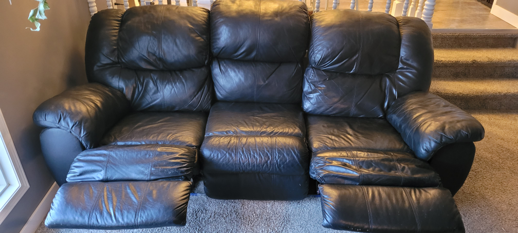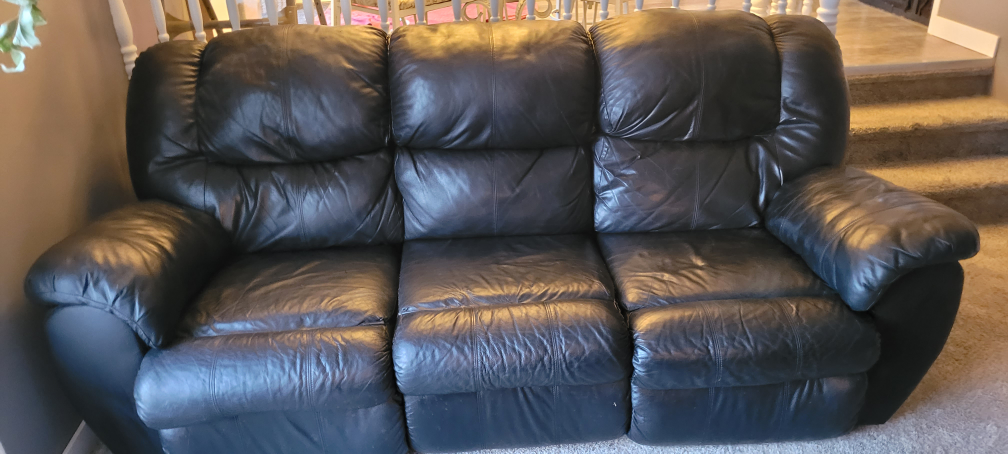 Matching black leather reclining sofa and loveseat. Three-seater sofa and two-seater loveseat. Used, shows some wear.