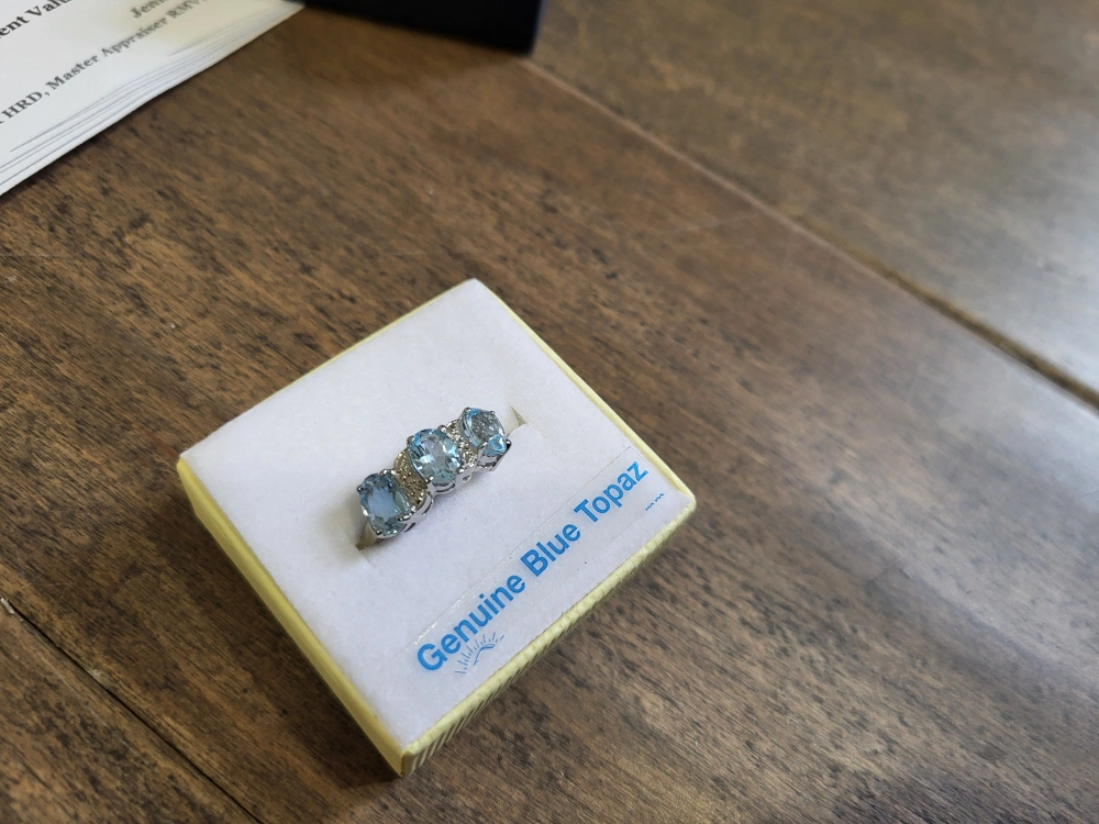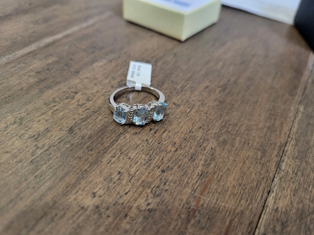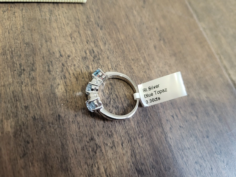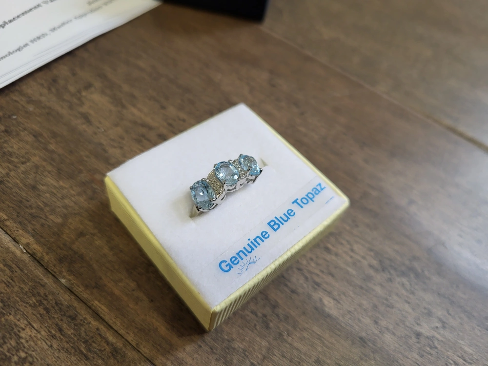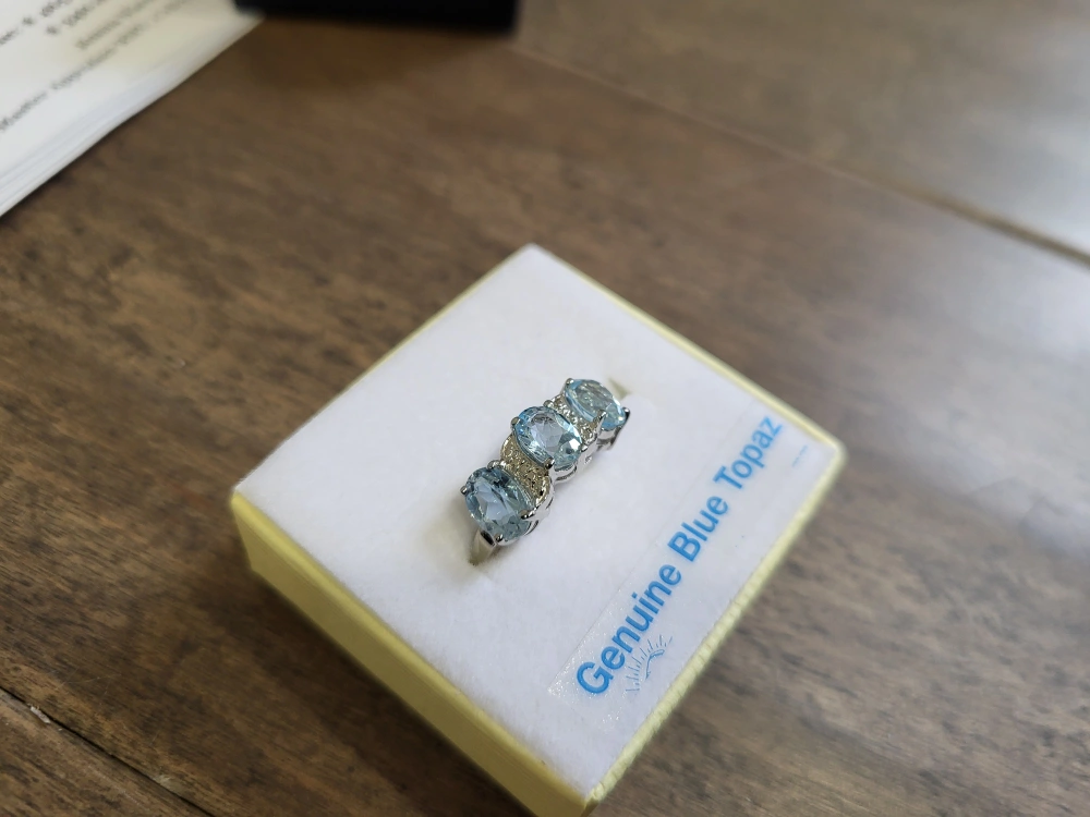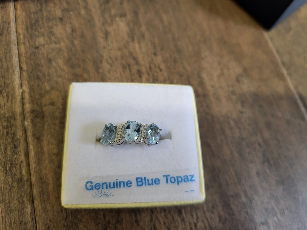 Beautiful three-stone blue topaz ring. Features genuine blue topaz gemstones. Set in sterling silver. Comes in box. 925 silver, natural blue stone.