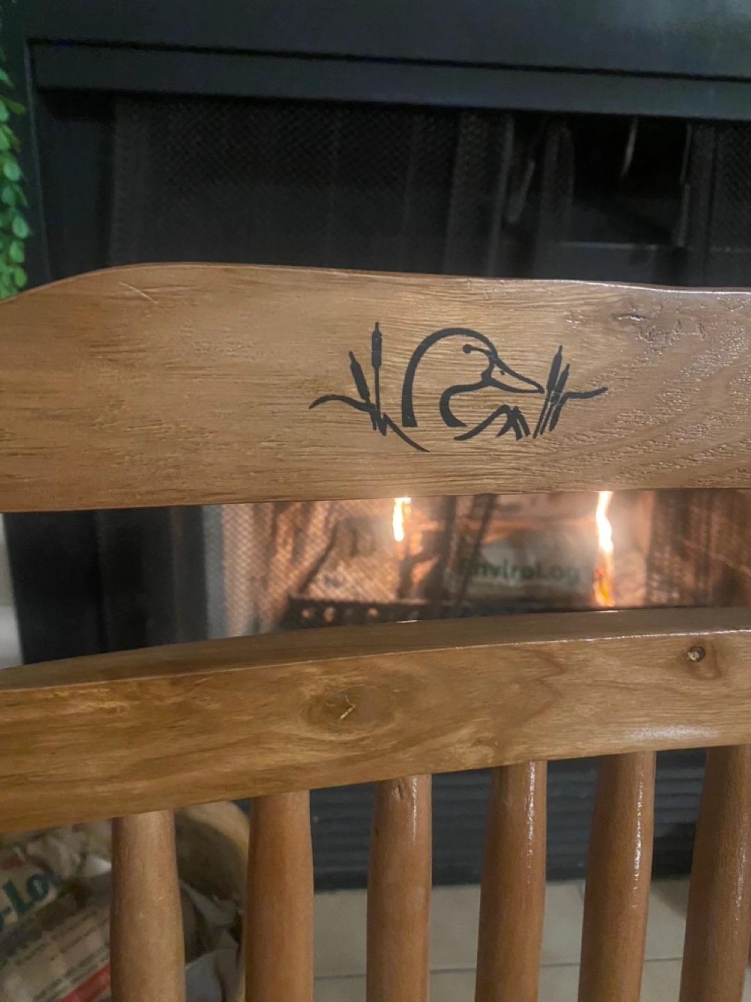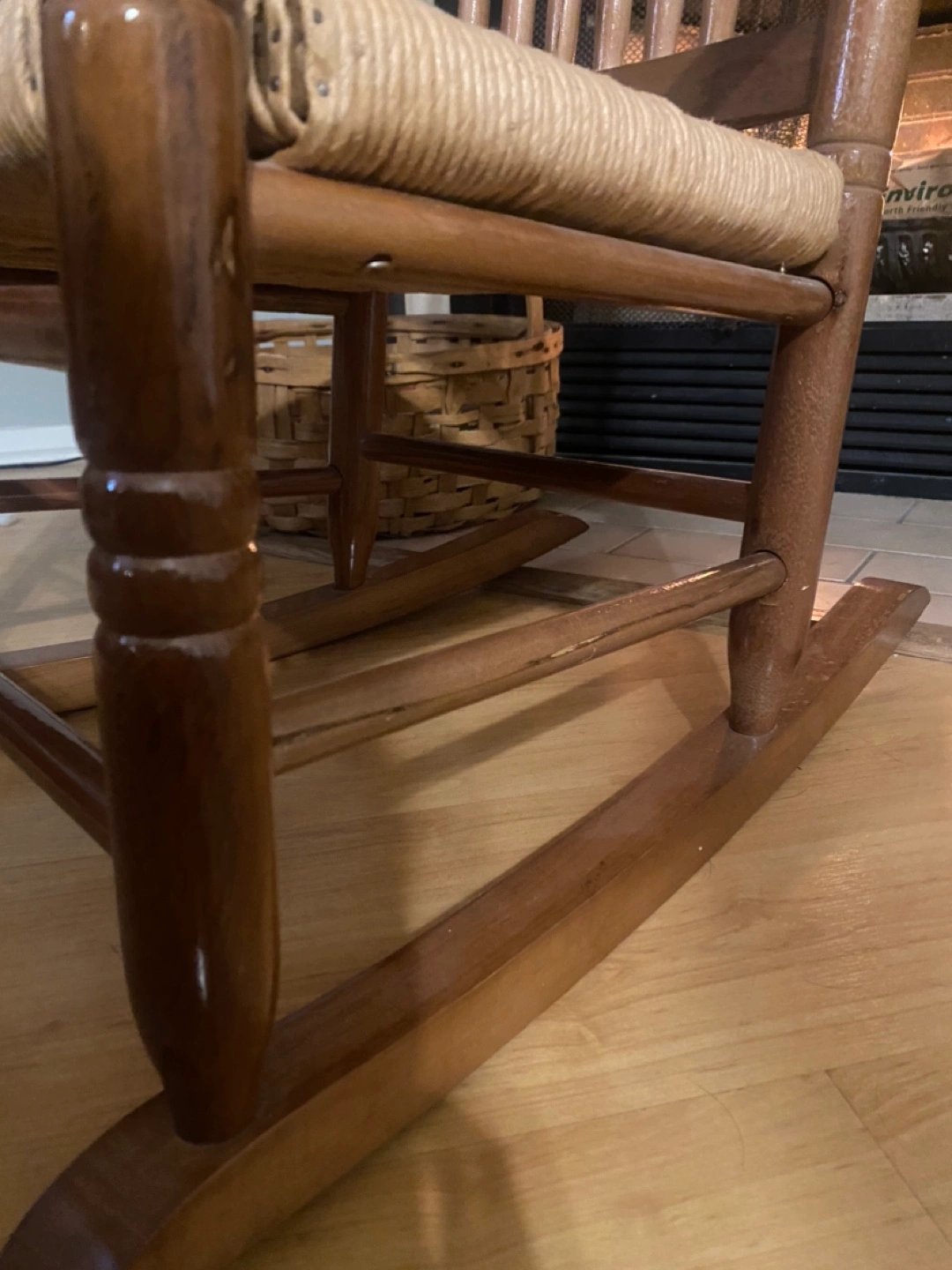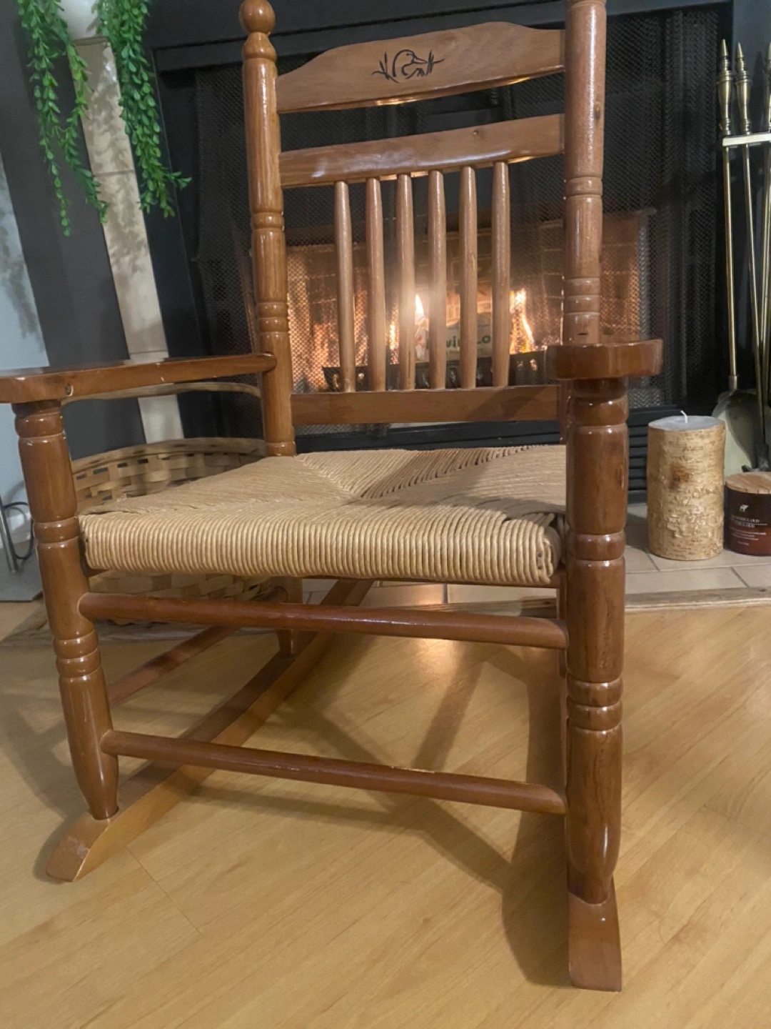 Rustic wooden rocking chair. Features a rush seat and decorative duck inlay on the back. Shows some minor wear consistent with age and use. Solid wood construction. Perfect addition to a cozy living room or bedroom.