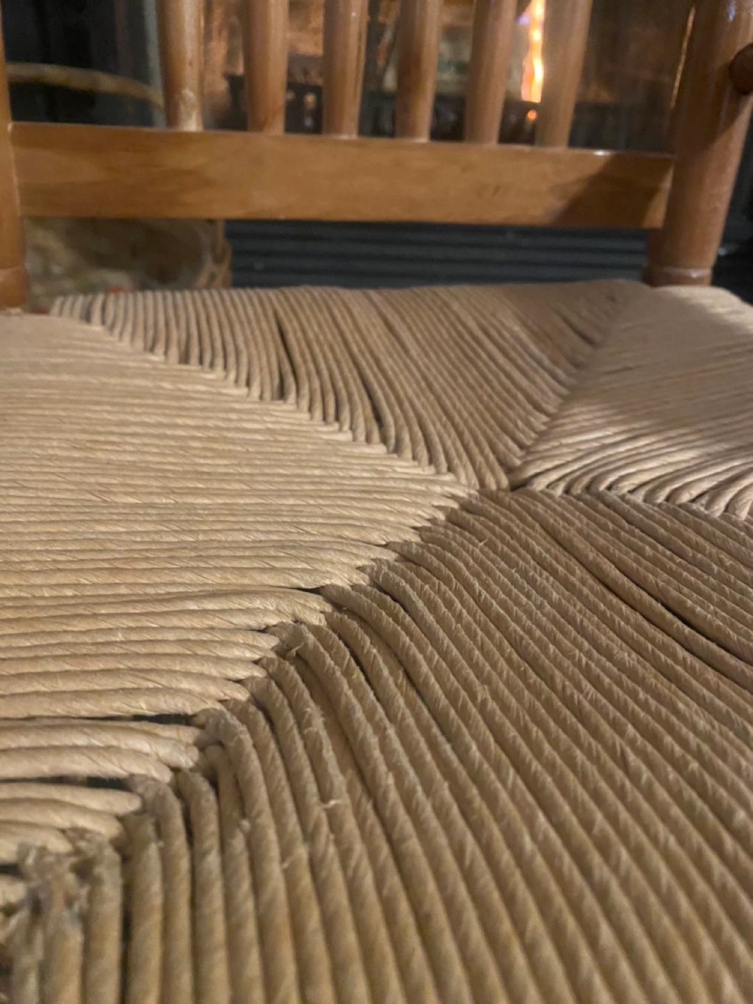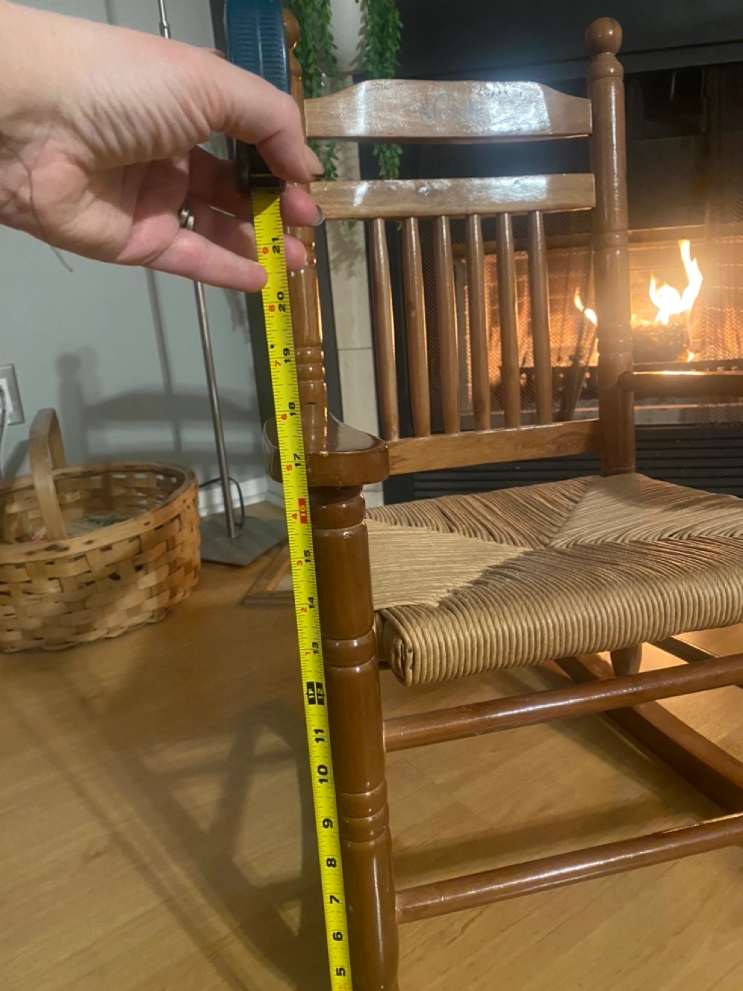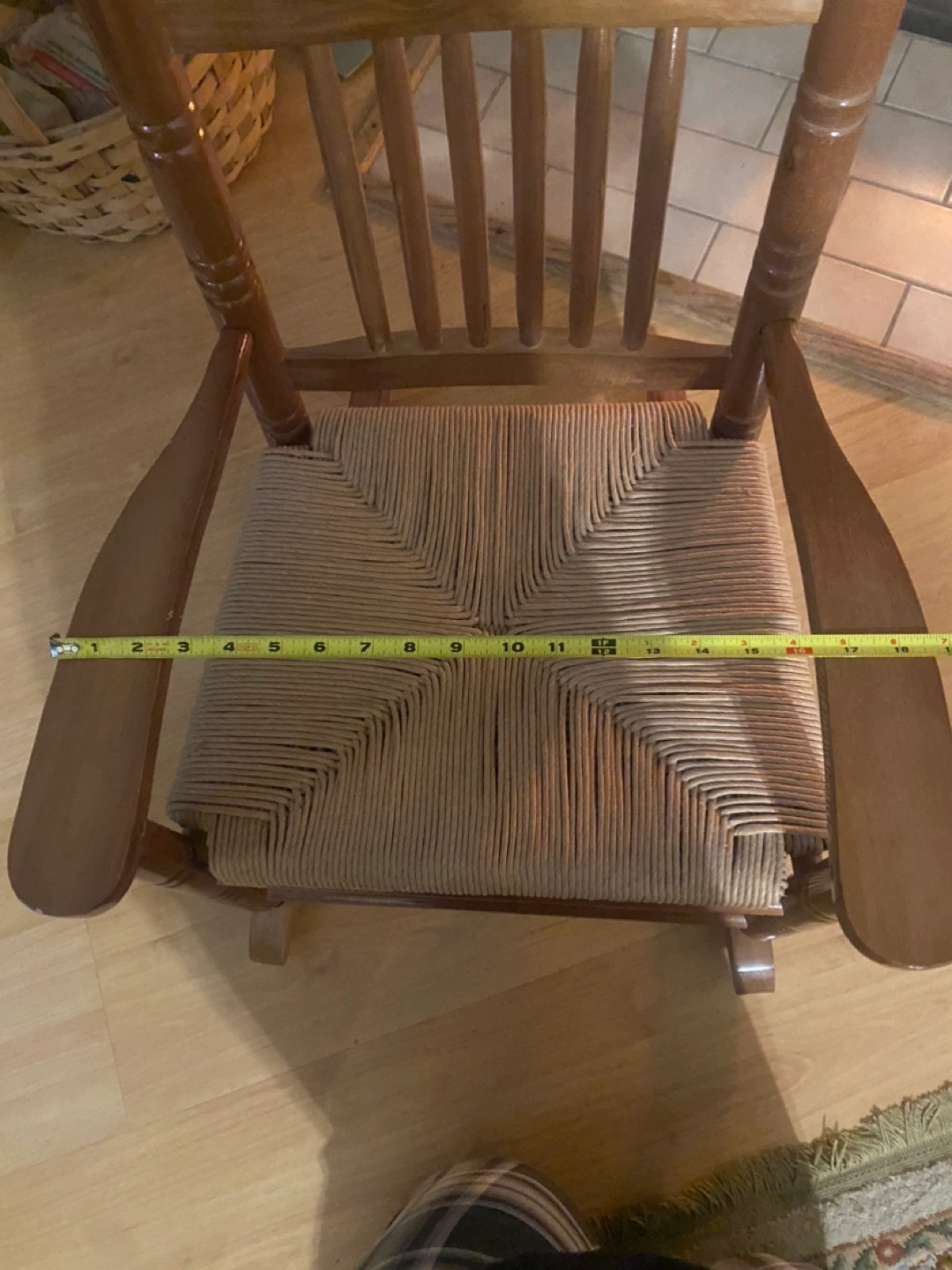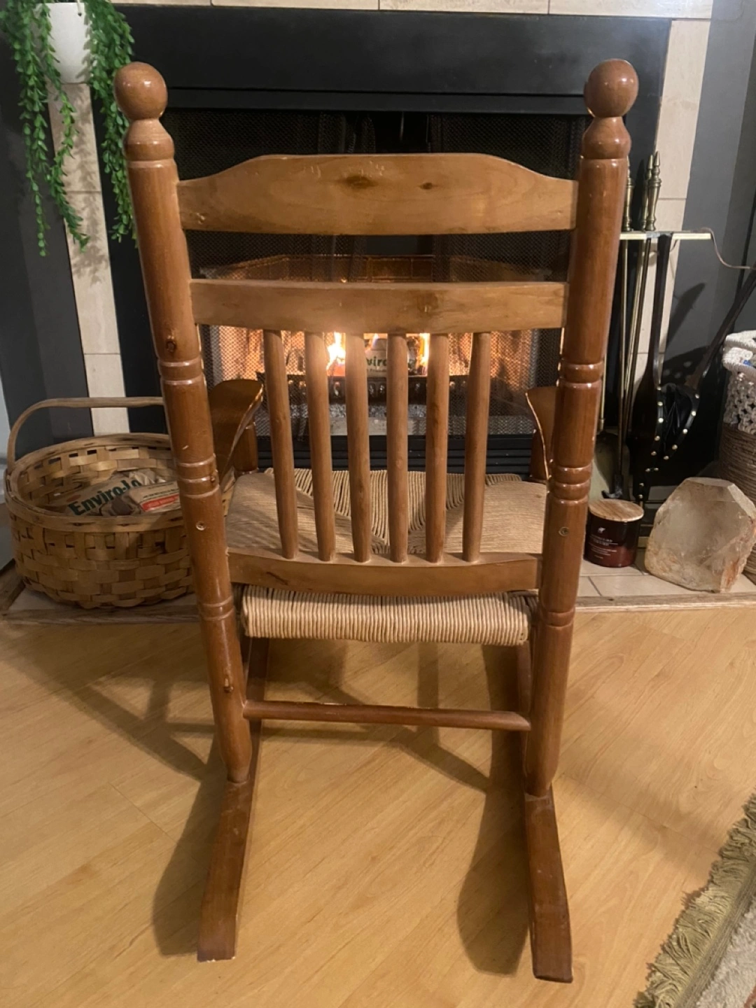 Rustic wooden rocking chair. Features a rush seat and decorative duck inlay on the back. Shows some minor wear consistent with age and use. Solid wood construction. Perfect addition to a cozy living room or bedroom.